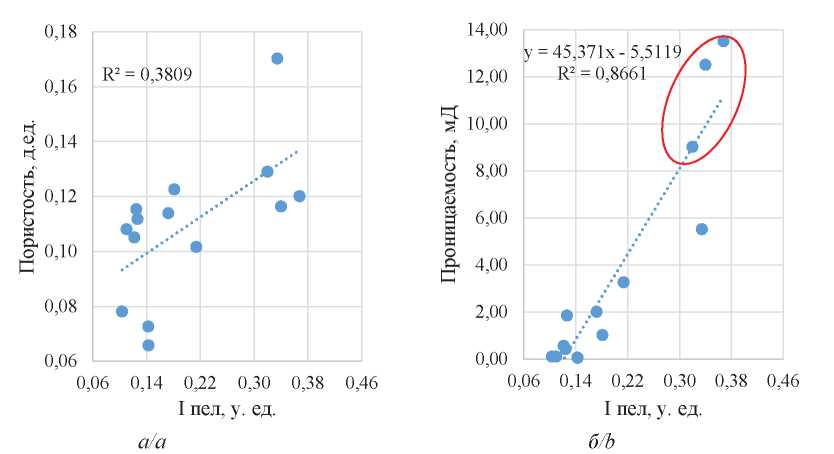 Анализ протекания в породе процесса пелитизации привел к выводу о том, что с ростом пелитизации увеличивается проницаемость, наблюдается высокая положительная корреляция (рис. 5).