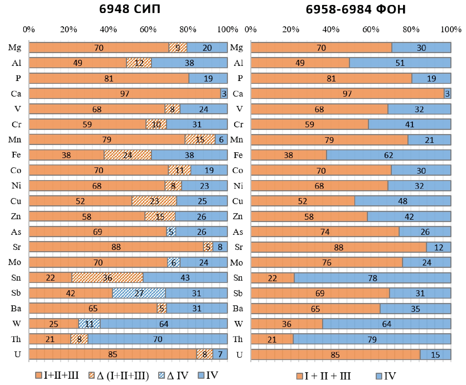 Визуально видна тенденция к снижению доли IV фракции на сиповой станции, что говорит о переходе элементов из инертной в подвижную форму. Наиболее значимые снижения доли IV фракции зафиксированы для Cu (–23 отн. %), Fe (–24 отн. %) и Sn (–36 отн. %), чуть меньшие – на уровне –10–20 отн. % – характерны для Cr, Co, Al, Mn, Zn. Также присутствуют элементы, для которых наблюдается обратная тенденция к росту доли остаточной фракции – сурьма (+27 отн. %) и вольфрам (+11 отн. %). В целом на совокупность III и IV форм приходится от 40–90 % от общего количества элемента.