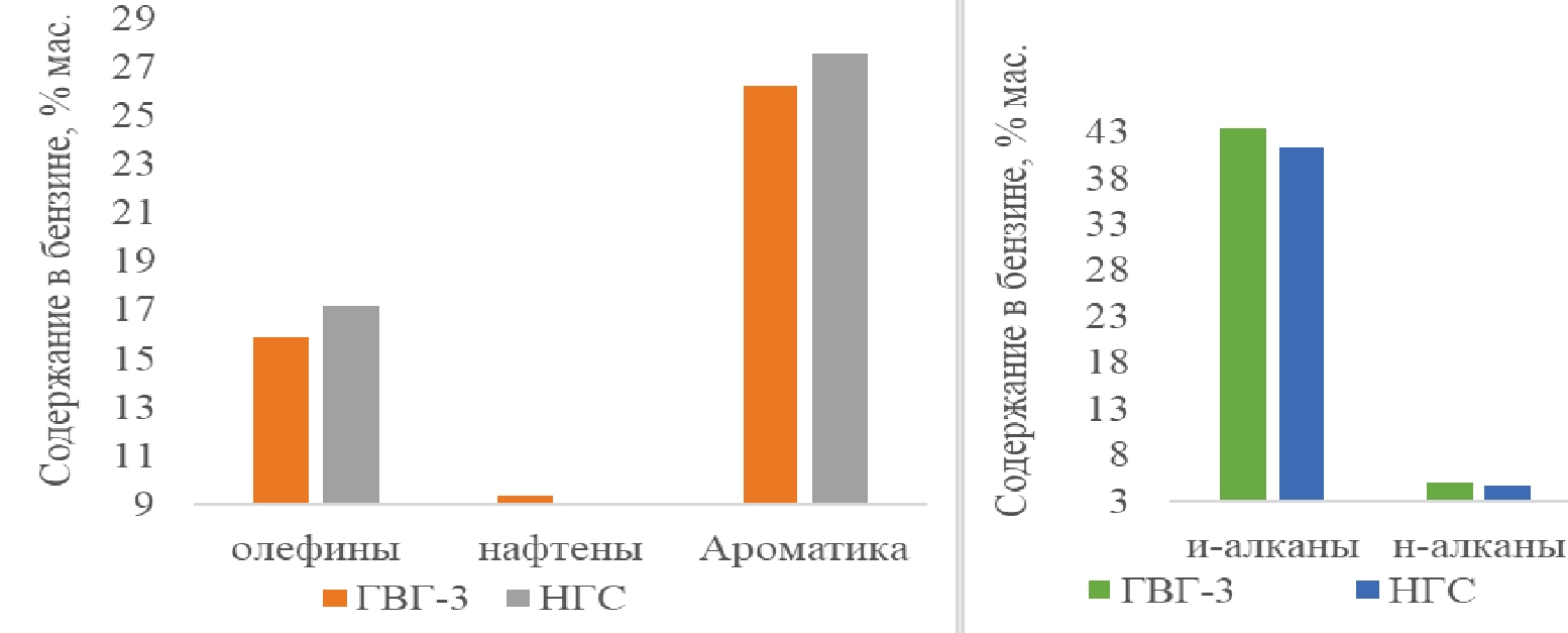 ГВГ – гидроочищенный вакуумный газойль; НГС – негидроочищенное сырье; Смолы 1 – бензольные смолы; Смолы 2 – спиртобензольные смолы/HVG – hydrotreated vacuum gas oil; NGR – non-hydrotreated raw materials; Resins 1 – benzene resin; Resins 2 – alcohol-benzene resins.