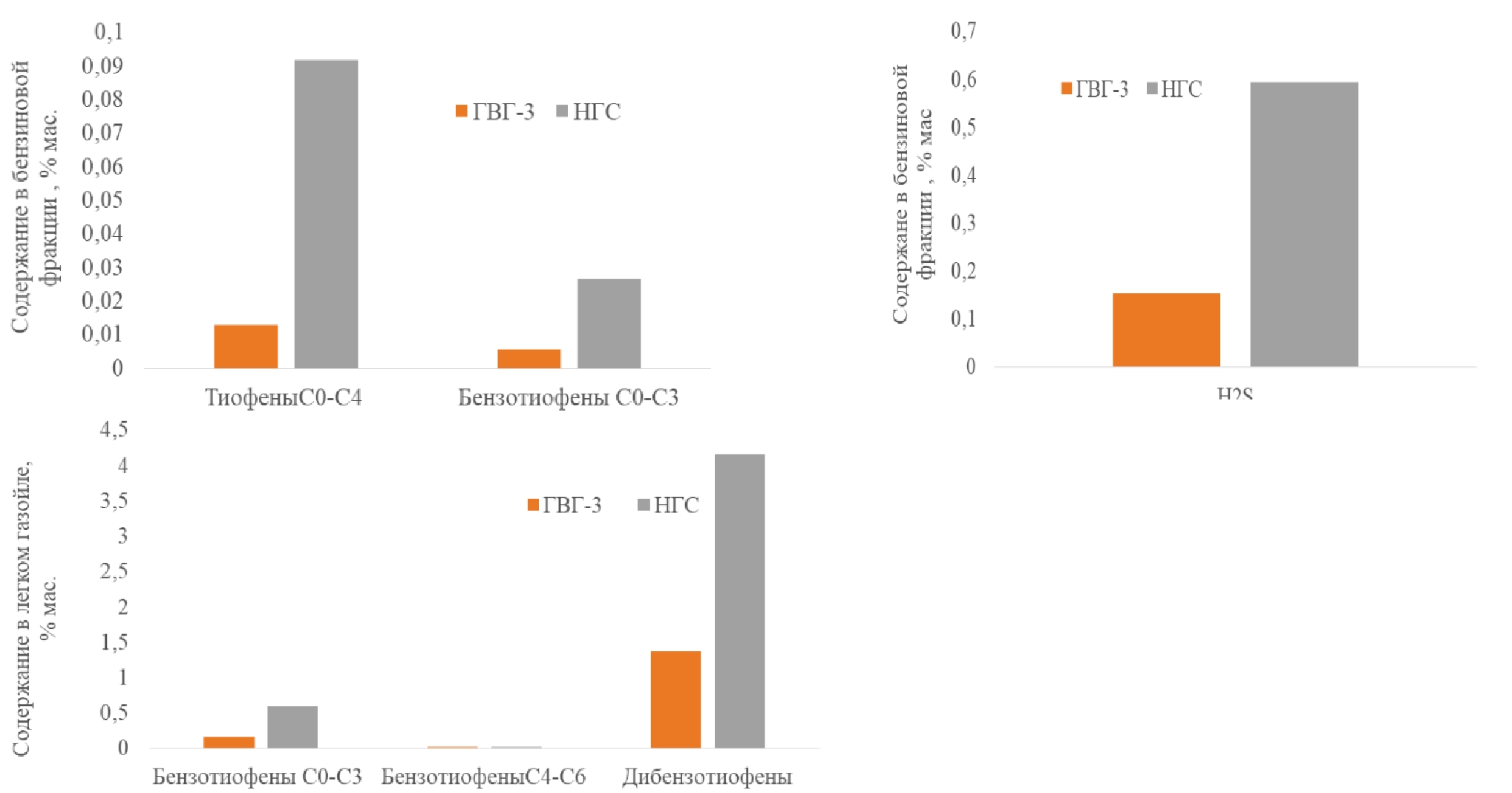 Согласно полученным результатам, наибольшая доля серосодержащих компонентов в гидроочищенном и негидроочищенном вакуумном газойле представлена конденсированными ароматическими серусодержащими компонентами, включая дибензотиофен и его производные, что связано с их низкой реакционной способностью в процессе гидрооблагораживания. Реакционная способность 1–3-кольцевых соединений серы уменьшается в следующем порядке: тиофен>бензотиофен> дибензотиофен [9]. В гидроочищенном вакуумном газойле (ГВГ-3) и негидроочищенном сырье (НГС) процесса отсутствуют тиофены и бензотиофены. Различия присутствуют в содержании высокомолекулярных сернистых соединений, а именно дибензотиофенов. Согласно полученным результатам, в гидроочищенном сырье отсутствуют высокомолекулярные сернистые соединения С4-дибензотиофен-бензонафтотиофены, при этом содержании их в негидроочищенном потоке составляет 2,0063 мас. %