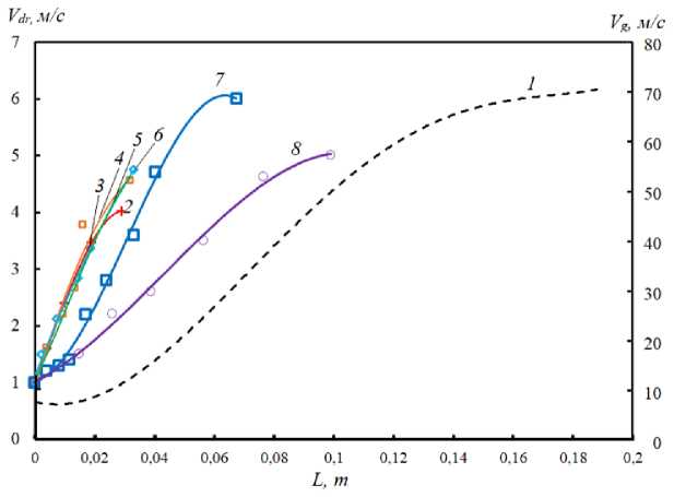 Рис. 4. Зависимость скорости воздуха (Vg – зависимость 1) и капель жидкости (Vdr – зависимости 2–7) от расстояния, пройдённого по сопловому тракту до момента дробления, при разной концентрации (φ) угля в суспензии: 1 – воздуха; 2 – капля воды (φ=0); 3 – капля ВУТ (φ=10); 4 – капля ВУТ (φ=20); 5 – капля ВУТ (φ=30); 6 – кап-ля ВУТ (φ=40); 7 – капля ВУТ (φ=50); 8 – капля ВУТ (φ=55)