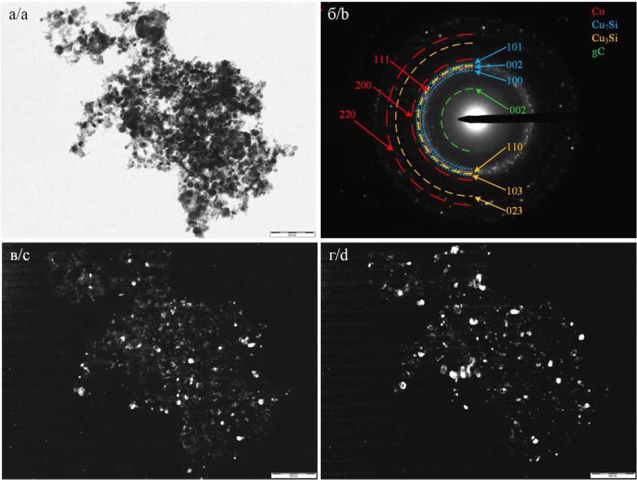 Так, темнопольный ПЭМ-снимок (рис. 3, в) получен при смещении апертурной диафрагмы в сторону области рефлекса силицида меди Cu3Si (023), причем размеры кристаллитов не превышают 50 нм. Однако размеры диафрагмы больше точечных рефлексов, и при съемке происходит захват соседних рефлексов (от других кристаллических фаз), чем обеспечивается свечение соответствующих отражающих плоскостей в темном поле. Поэтому светящиеся частицы на темнопольном ПЭМ-снимке (рис. 3, г) могут принадлежать не только меди Cu (220), но и менее интенсивным рефлексам силицидов меди, например, Cu7Si (110).