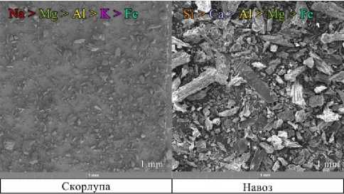 Рис. 2. СЭМ-изображения исследуемого сырья и содержание основных элементов в минеральной части