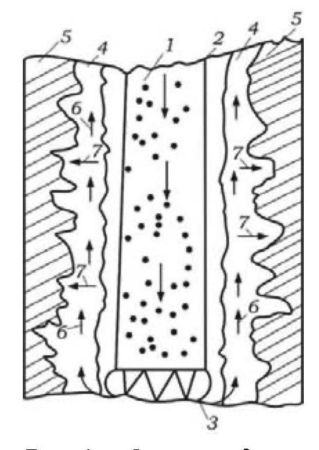 Fig. 1. Scheme of drilling fluid ion hydration: 1 – drilling mud, 2 – drill string, 3 – drill bit, 4 – MMP melting zone, 5 – MMP, 6 – direction of drilling mud movement, 7 – direction of ions hydration