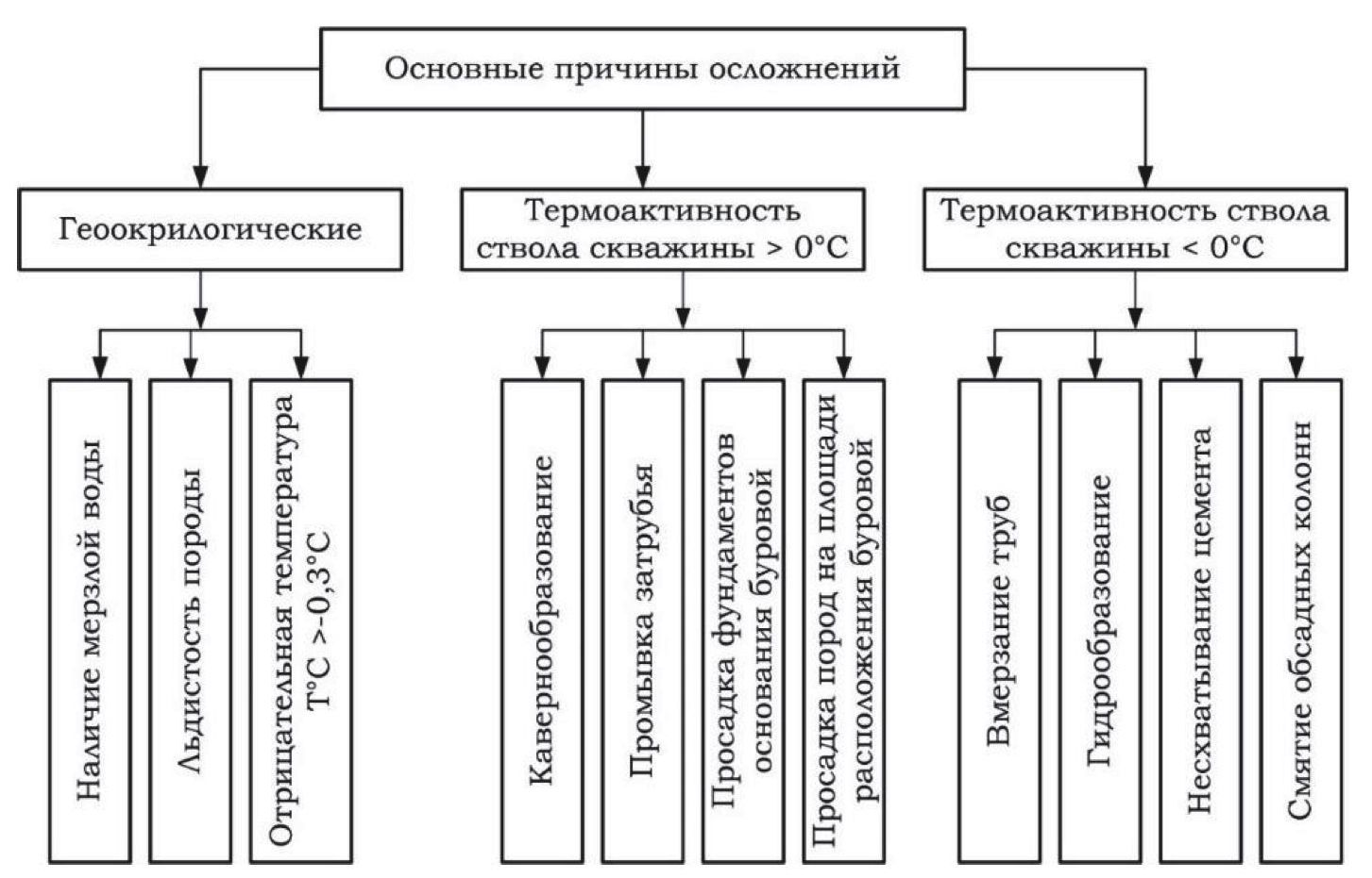 Схема основных причин осложнений, возникающих при бурении скважин в ММП, показана на рис. 2.