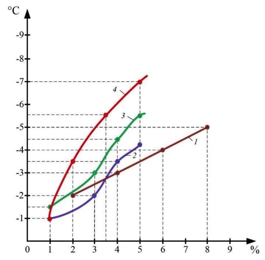 Fig. 3. Impact of KCl and CaCl2 salts, morosol and polyglycol content on drilling mud freezing point: 1 – calcium chloride and potassium chloride; 2 – morosol 2; 3 – polyglycol; 4 – declared solution