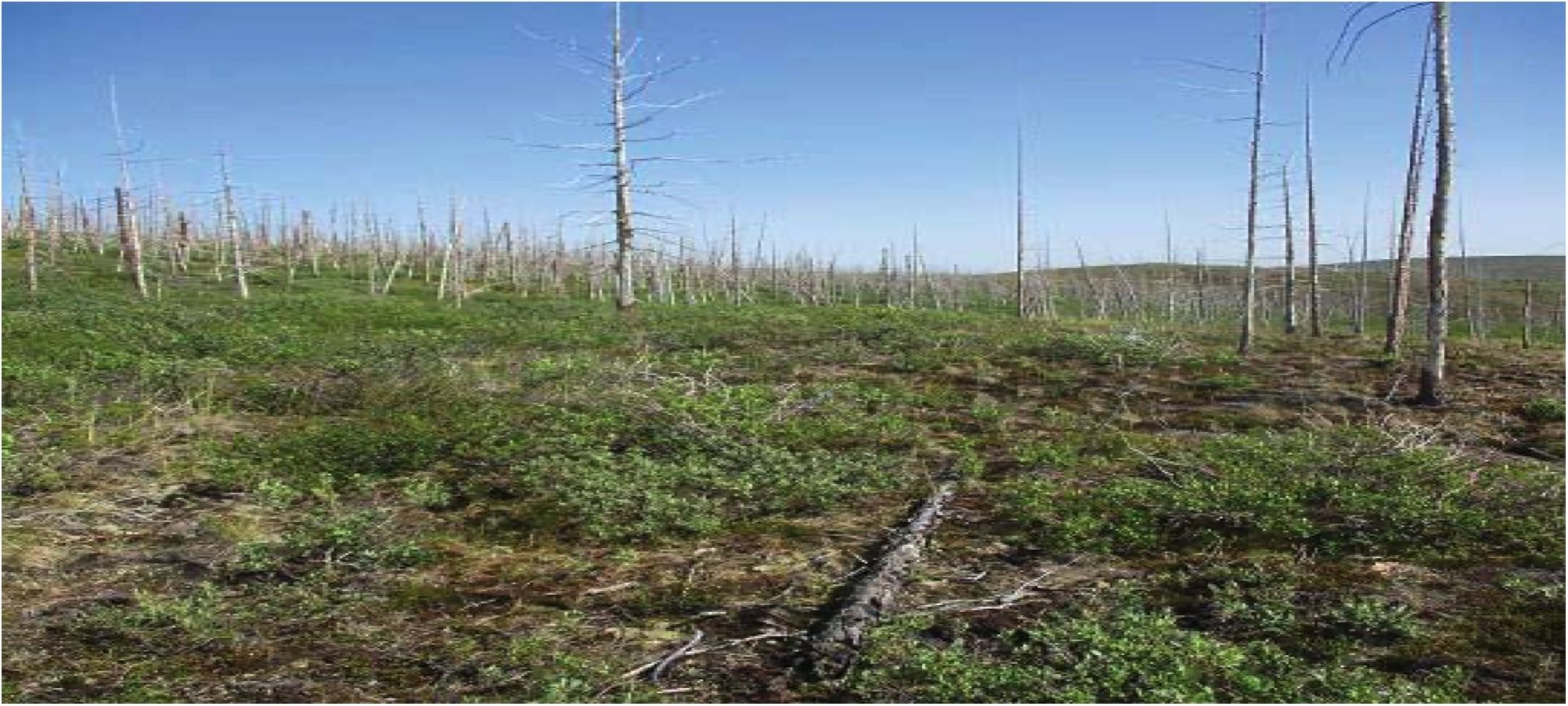 Лишайники были представлены видами Cetraria islandica, Cladonia rangiferina, Cladonia alpestris. Следует отметить, что лишайники сохранились в основном в низинах и за буграми с подветренной стороны. Среди кустарничков наблюдались голубика, морошка, черника, брусника. Пожары относительно редки в экосистемах субарктической лесотундры, но они могут сильно изменить свойства экосистем – на исследуемой территории полностью выгорела древесная растительность (карликовая береза, полярная ива).