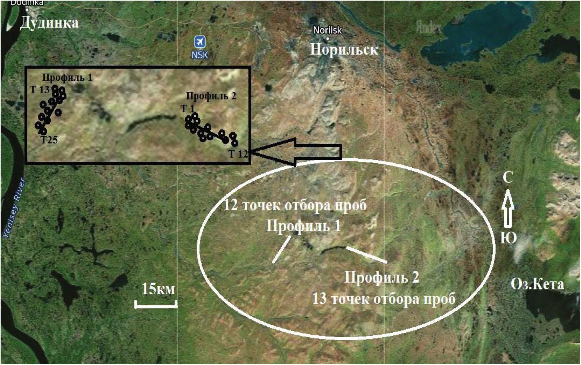 Образцы почвы и лишайников [видов Cladonia rungeferinа ((L.) Weber ex F.H.Wigg) и Cetraria sp.] отбирались с одних и тех же площадок, отбор образцов осуществлялся условно по схеме двух профилей: профиль 1 – СВ-ЮЗ протяженностью 20 км, и профиль 2 – СЗ-ЮВ протяженностью 14 км с шагом около 0,5–2 км (в зависимости от наличия или отсутствия необходимых лишайников шаг изменялся в широких пределах) (рис. 3).