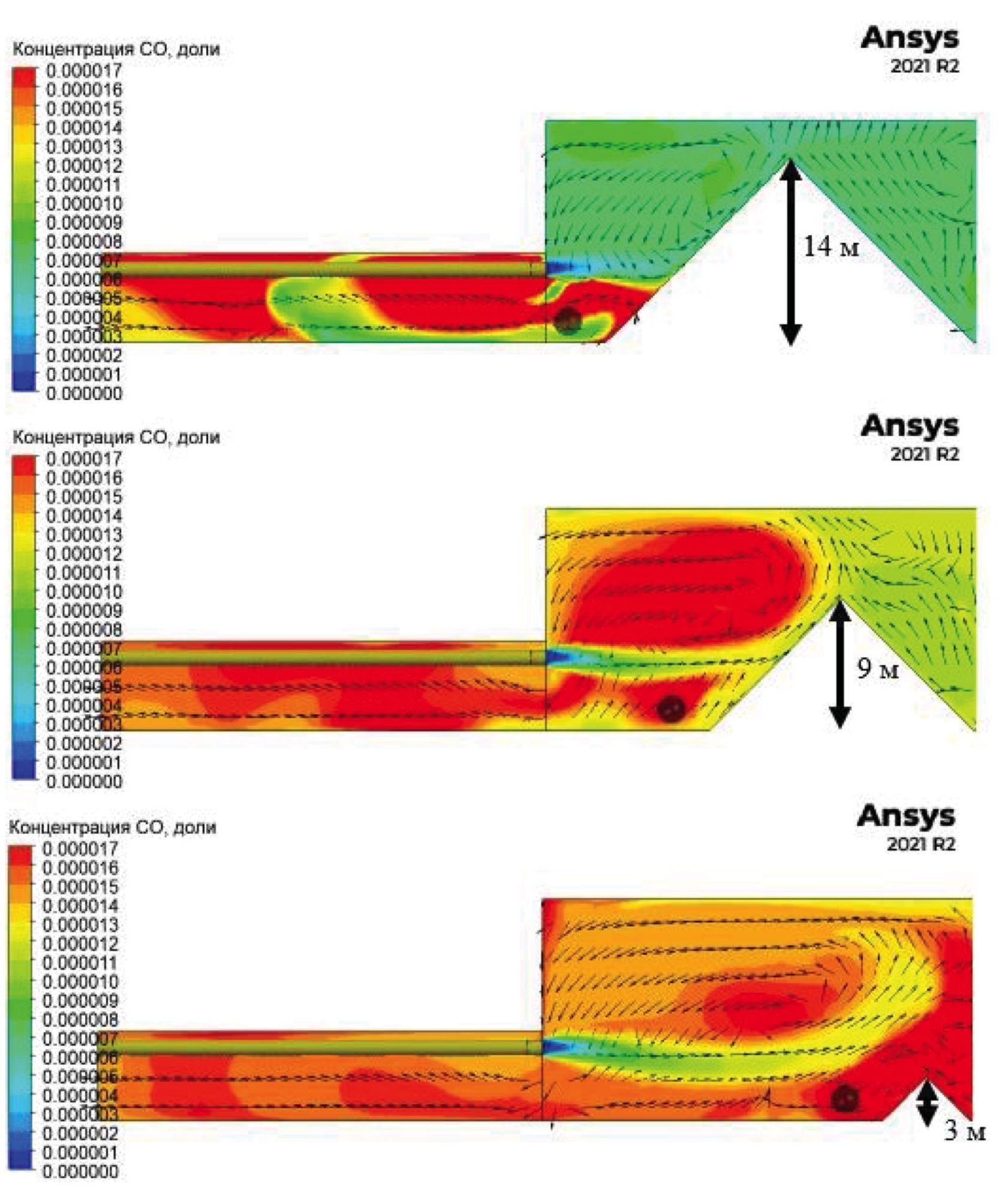 Источник газовыделения представлен сферой диаметром 1 м с целью упрощения расчета. В качестве газа выбран оксид углерода (CO). Скорость движения газовоздушной смеси соответствует выделению 0,23 кг/с газа. Концентрация газа при этом соответствует 75, 100 и 125 предельно‑допустимым концентрациям (в первом, втором и третьем случаях соответственно).