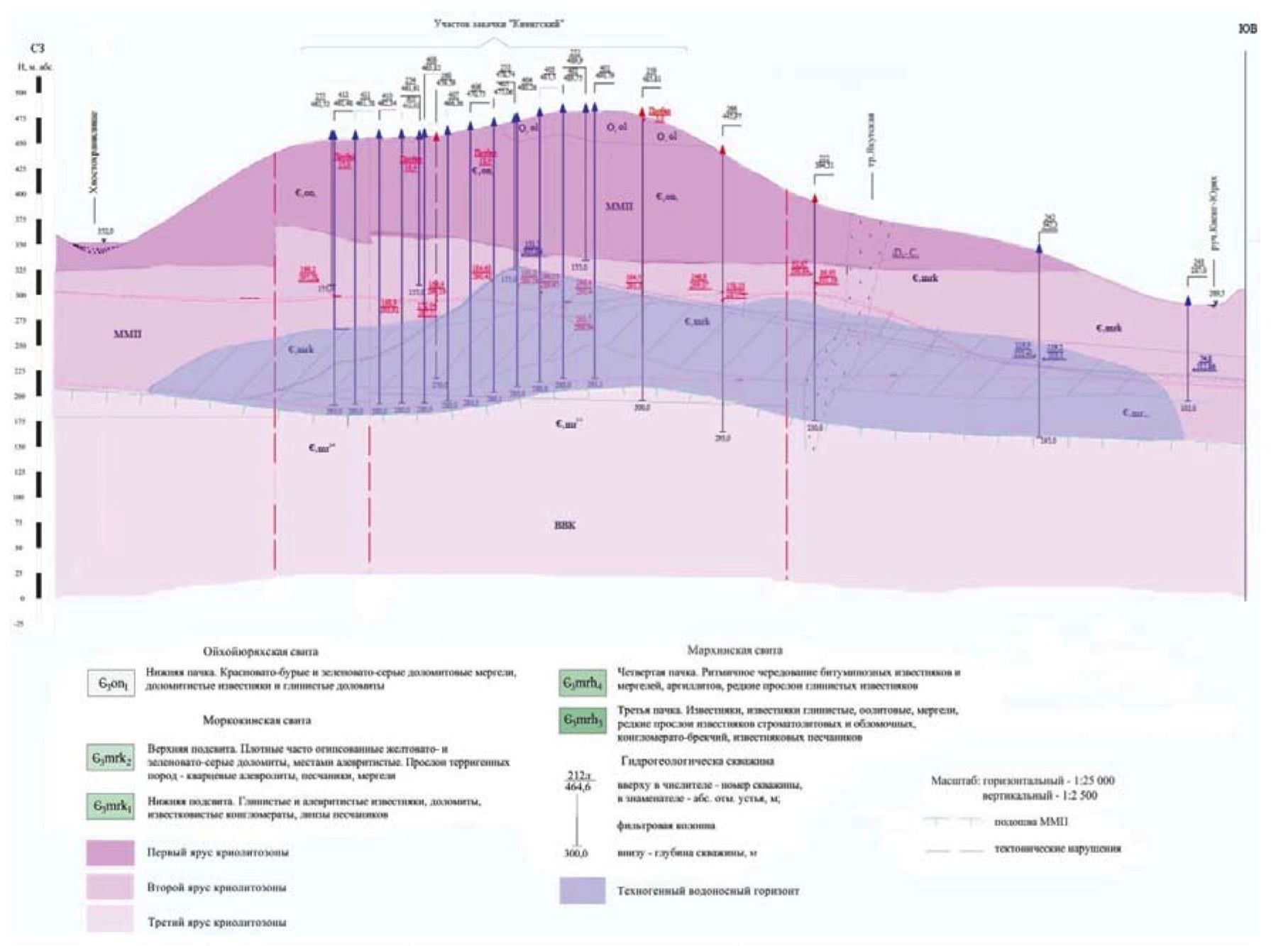 Многолетнемёрзлые породы представлены карбонатно-глинистыми отложениями моркокинской, реже мархинской свит, а на участке «Киенгский» еще и породами онхойюряхской свиты и олдондинской свиты нижнего ордовика. Верхний ярус слагают ММП, содержащие льды различных типов, заполняющие поры, каверны, трещины [12]. Нижний ярус состоит из охлажденных пород, пустоты которых заполнены солеными водами и рассолами с отрицательной температурой – криопэгами. Промежуточное значение занимает ярус морозных недонасыщенных пород. Необходимо отметить, что в процессе различных исследований последних лет в регионе представление о строении верхнего яруса криолитозоны несколько изменилось. Некоторыми скважинами в толще ММП зафиксированы реликтовые линзы соленых вод и рассолов в нижнеордовикских отложениях. Изолированность и линзообразный характер таких водонасыщенных толщ доказаны с помощью опытно-фильтрационных исследований. Наличие реликтовых линз послужило основанием для выделения межмерзлотного типа подземных вод [12, 13]. Они служат зоной постепенного перехода от ММП к водонасыщенным и одновременно охлажденным породам, имеющим отрицательную температуру. Мощность этой переходной зоны незначительная и не превышает 10 м. Кроме того, в мерзлой толще встречаются единичные маломощные (до 1–5 м) линзы талых пород, не содержащие гравитационную воду. Они могут залегать на различных глубинах в зависимости от мощности яруса ММП.