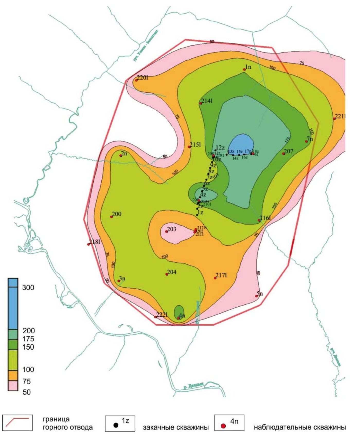 Учитывая принцип продвижения закачиваемых рассолов в породах второго яруса криолитозоны, а также результаты режимных наблюдений, ставших основой для прогнозного гидродинамического моделирования, можно с уверенностью констатировать, что эксплуатация участков привела к вовлечению в процесс формирования техногенных водоносных горизонтов существенных объёмов вод криолитозоны. Подтверждением данного факта служит существенное уменьшение минерализации вод (с 300-350 до 40-60 г/литр), фиксируемое при опробовании наблюдательных скважин периферийных частей участков.