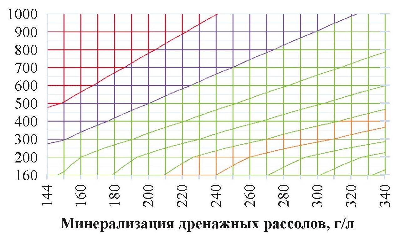 где Мсм – минерализация техногенного водоносного горизонта, сформировавшаяся в результате смешения дренажных рассолов и вод криогенной толщи; Мтв – средняя минерализация вод криогенной толщи, замеренная в льдистой фракции кернового материала в процессе бурения, которая составляет 2 г/л.; Qтв – расход вод криолитозоны, возникающий в результате плавления льда; Мр – минерализация дренажных рассолов, составляет 350 г/л; Qр – расход закачки дренажных рассолов (средневзвешенное значение расхода за год).
