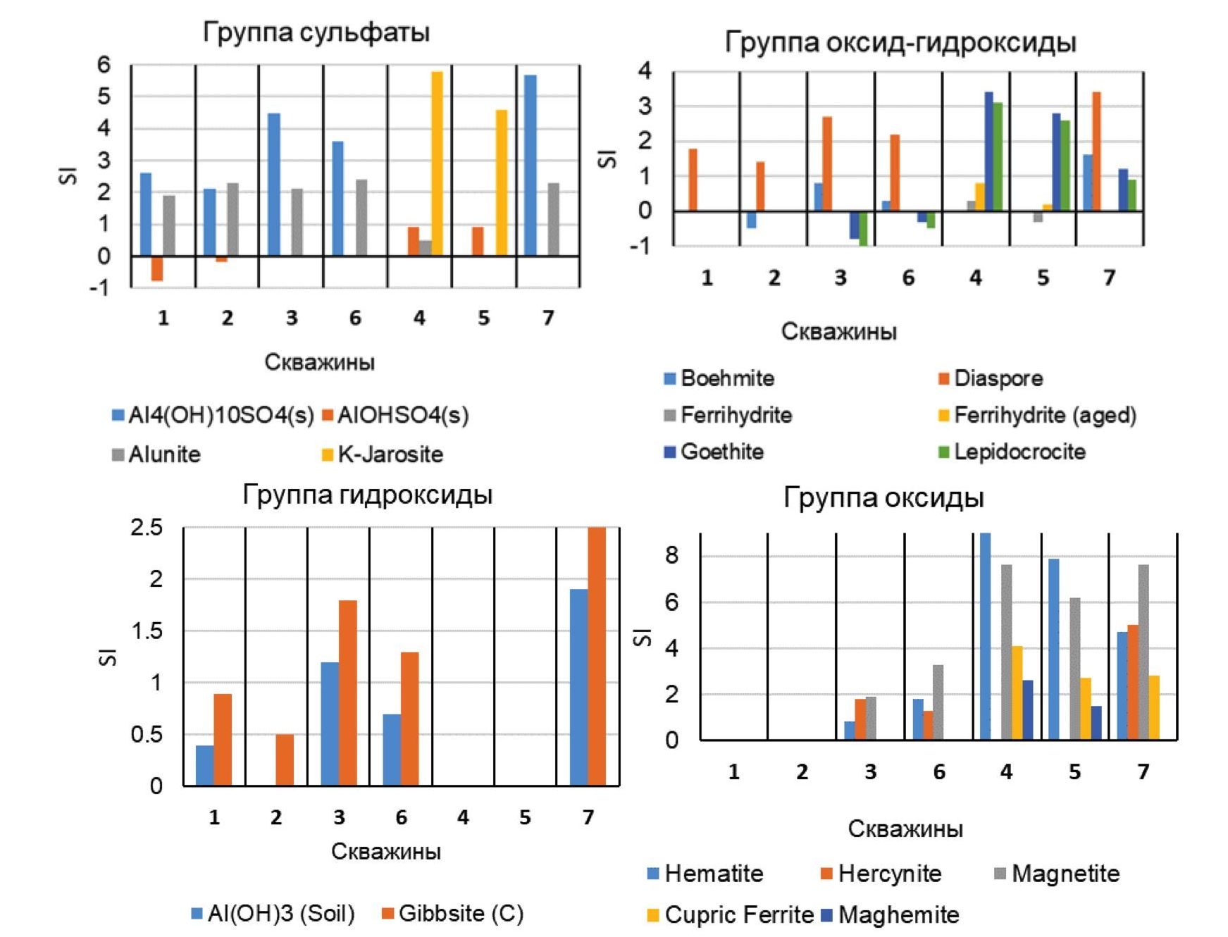 Вода в скважинах № 1, 2, 3 и 6 характеризуются идентичными индексами насыщения по минералам групп сульфаты, гидроксиды и карбонаты. Они пересыщены по отношению к Al4(ОН)10SO4(s) (от 2,1 до 4,5), алуниту (от 1,9 до 2,4), диаспору (от 1,4 до 2,7) и гиббситу (от 0,5 до 1,8). Вторая группа – это вода в скважинах № 4 и 5, здесь отмечается пересыщение по отношению к минералам групп оксиды, сульфаты, оксид-гидроксиды и галогениды: гематиту (9,1–7,9), магнетиту (7,6–6,2), ярозиту (5,8–4,6), гетиту (3,4–2,8) и лепидокрокиту (3,1– 2,6). В третьей группе (скважина № 7) наблюдается небольшое перенасыщение по минералам карбонатной группы (MnСО3(am) и родохрозиту), а также по Al4(ОН)10SO4(s) (5,7), гиббситу (2,5) и диаспору (3,4) (табл. 2).