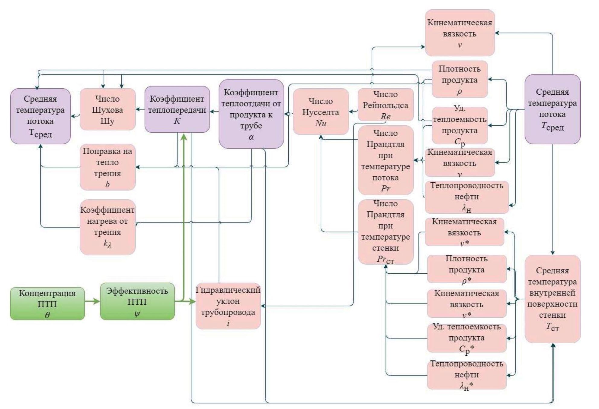 Параметры, входящие в среднюю температуру потока (вычисляется как среднее арифметическое температур в начале и конце участка), сами зависят от средней температуры потока, поэтому для расчета применялся метод итераций. Итерируемые параметры выделены на рис. 1 фиолетовым цветом. При этом после добавления присадки меняется коэффициент теплопередачи (формула (13)) и гидравлический уклон трубопровода (формула (8)). Не допустимо в новом расчете температуры с присадкой применять значения остальных параметров прежними, так как они зависят от температуры потока, следовательно, повторно использовался метод итераций.