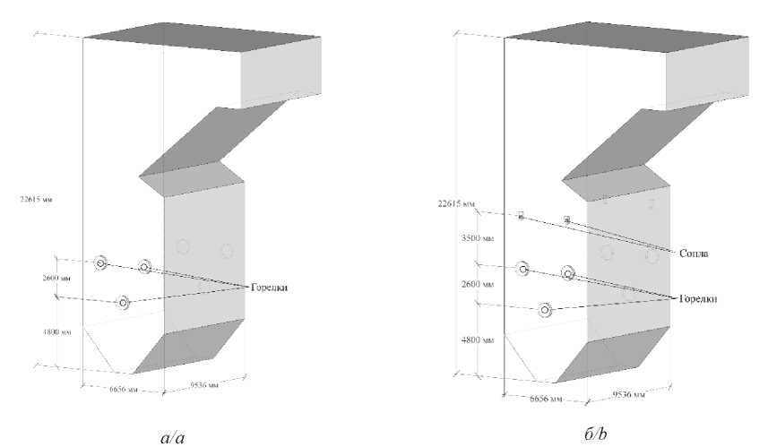 С целью снижения генерации NOx рассматривается модифицированный вариант топочной камеры с учетом сопел третичного дутья, установленных над основными горелками (рис. 1, б). На высотной отметке 10900 мм установлены четыре сопла, по два на каждой из боковых стен. Размеры выходного сечения каждого из сопел составляют 500×242 мм.