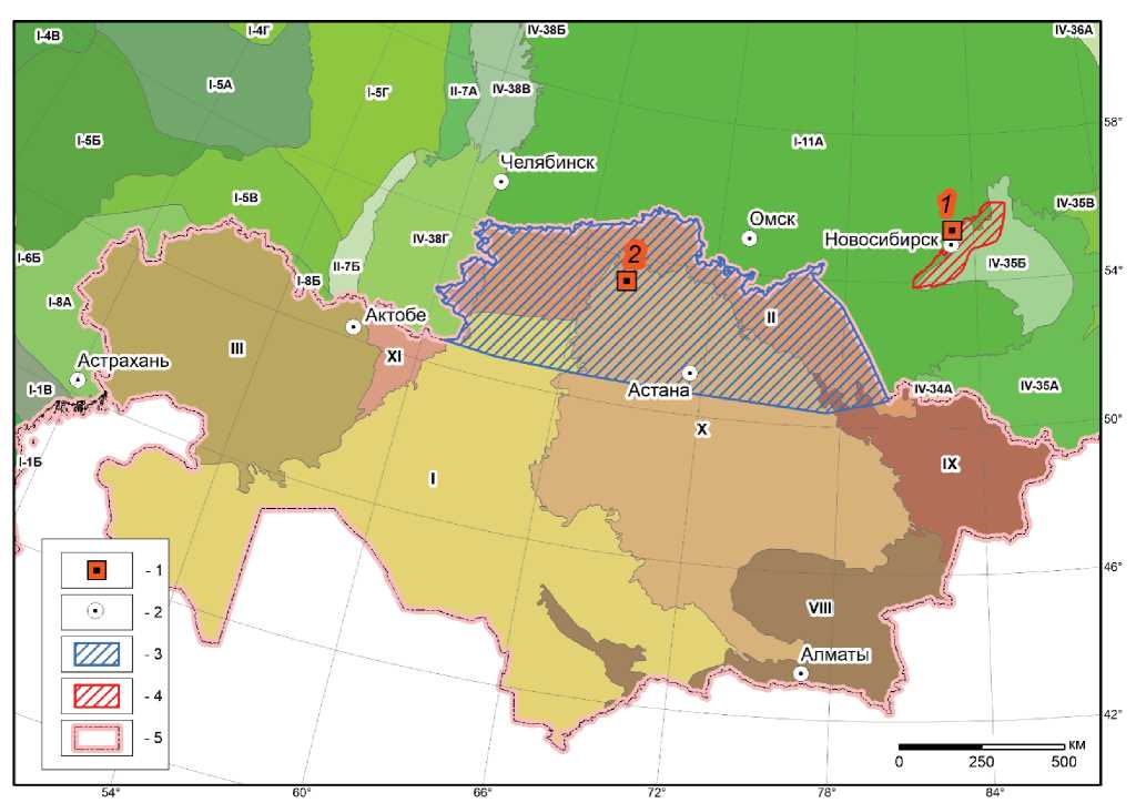 Рис. 1. Местоположение района исследований. Условные обозначения: 1 – месторождение урана: 1 – Пригородное, 2 – Грачевское; 2 – крупный город; 3 – территория исследования в пределах республики Казахстан; 4 – территория исследований в пределах России (фрагмент Обь-Зайсанской складчатой области); 5 – государственная граница. Гидрогеологические структуры в пределах России: I-1Б – Восточно-Предкавказский АБ; I-1В – Ергенинский АБ; I-4А – Северо-Двинский АБ; I-4В – Московский АБ; I-4Г – Ветлужский АБ; I-5А – Волго-Сурский АБ; I-5Б – Приволжско-Хоперский АБ; I-5В – Сыртовский АБ; I-5Г – Камско-Вятский АБ; I-6Б – Донецко-Донской АБ; I-8А – Северо-Каспийский АБ; I-8Б – Эмбенский АБ; II-7А – Юрюзано-Сылвинский ПАБ; II-7Б – Бельский ПАБ; I-10Б – Печорский АБ; I-10В – Печеро-Предуральский ПАБ; I-11А – Иртыш-Обской АБ; I-11Б – Тазовско-Пурский АБ; I-14А – Камо-Вельминский АБ; I-14Е – Восточно-Енисейский АБ; IV-10А – Канино-Тиманская ГСО; IV-34А – Жарминско-Алтайская ГСО; IV-35А – Алтае-Саянская ГСО; IV-35Б – Кузнецкая ГСО; IV‑35В – Минусинская ГСО; IV-36А – Северо-Енисейская ГСО; IV-38Б – Северо-Уральская ГСО; IV-38В – Среднеуральская ГСО; IV-38Г – Южно-Уральская ГСО. Гидрогеологические структуры в пределах Казахстана: I – Скифско-Туранский регион; II – Западно-Сибирский регион; III – Восточно-Европейский регион; VIII – Жетысу-Алатау-Тянь-Шаньский регион; IX – Енисей-Саяно-Алтайский регион; X – Центрально-Казахстанский регион; XI – Таймыро-Уральский регион