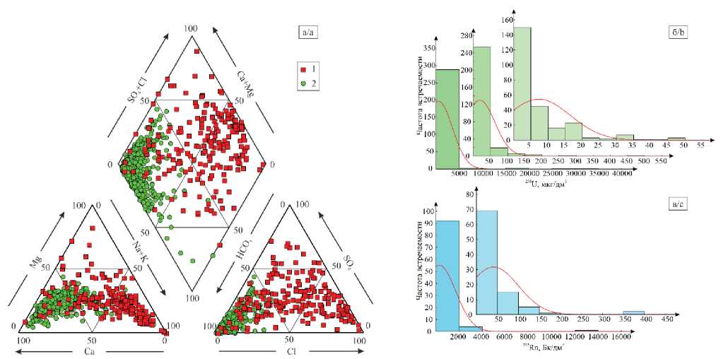 Рис. 2. Диаграмма Пайпера химического состава подземных вод (а) Северного Казахстана (1) и Обь-Зайсанской складчатой области (2); распределение урана-238 (б) и радона-222 (в) в подземных водах Северного Казахстана