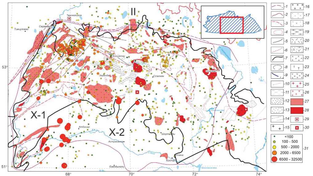 Fig. 4. Radioecological map of Northern Kazakhstan. Contours of Paleozoic metallogenic units: 1 – metallogenic belt with potential uranium content; 2 – uranium ore provinces; 3 – uranium ore and rare metal-uranium-thorium structural-metallogenic zones; 4 – uranium ore areas; Rupture violations: 5 – established 1st order; 6 – discontinuities – channels for the entry of radionuclides; 7 – boundaries of hydrogeological divisions: II – West Siberian region; X-1 – Shyngys-Kokshetau basin; X-2 – Teniz-Korgalzhinsky basin; 8 – contours of geological formations; Boundaries of WPO pinchout: 9 – areas of distribution of thorium-containing rare-earth-titanium placers; 10 – siliceous-carbonaceous shales; Lithological types of rocks with increased background radiation: Sedimentary – 11 – coal-bearing; 12 – sandy; 13 – sand-gravelite; 14 – siliceous-carbonaceous shales, carbonaceous sandstones; Intrusive – 15 – alaskite granites; 16 – normal granites; 17 – granodiorites; 18 – diorites; 19 – granitized metamorphites; Volcanogenic: 20 – rhyolites; 21 – rhyolite tuffs; 22 – dacites; 23 – trachytes; 24 – andesites; Rocks specialized for uranium and thorium U>>10 g/t, Th>>35 g/t: 25 – alaskites; 26 – granites; Fields of distribution of geological formations with high contents of uranium and thorium: 27 – U – 5–10 g/t; Th – 10–35 g/t; 28 –U>10 g/t; Th>35 g/t; In Mesozoic-Cenozoic deposits – 29 – exodiagenetic uranium occurrences in gray sediments of paleovalleys; 30 – the same in essentially clayey alluvial-lacustrine deposits; 31 – uranium content in the water sample, µg/dm3