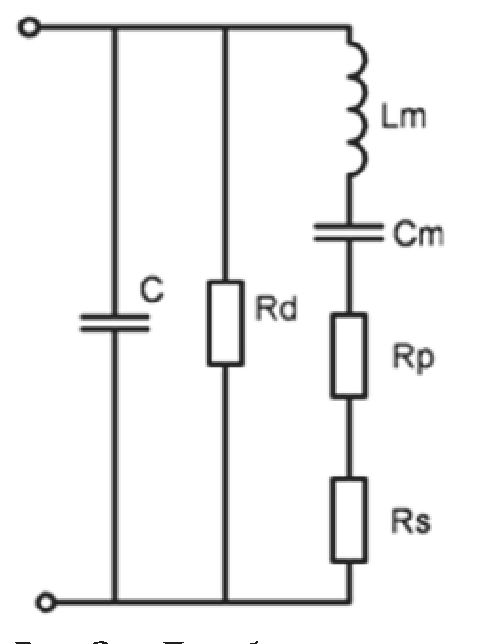 Используя теорию электромеханических аналогий, можно заменить пьезоэлектрический преобразователь его электрической эквивалентной схемой рис. 2. Такая аналогия справедлива только вблизи механического резонанса и не способна описать поведение преобразователя в широком частотном диапазоне [24].