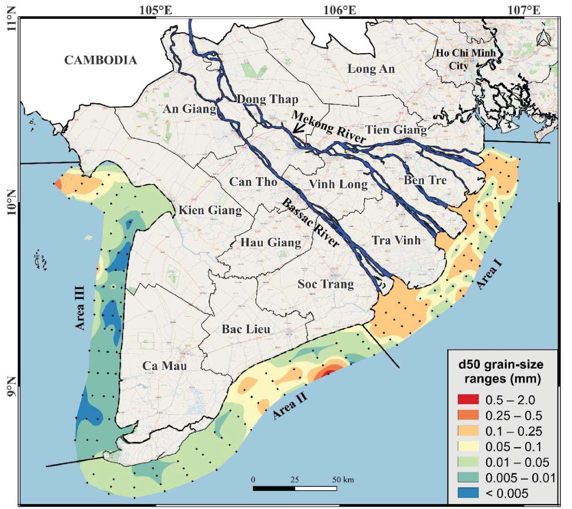 Methods. In order to illustrate changes in sea-bed surface sediment grain size between the two monsoons, we focused on the median grain size, a widely used parameter for sediment transport calculation, and created spatial maps of median grain size along the coastal areas of the Mekong Delta. The analysis was based on sediment samples collected along the coastal areas of the Mekong Delta during field excursions in the southwest and northeast seasons.