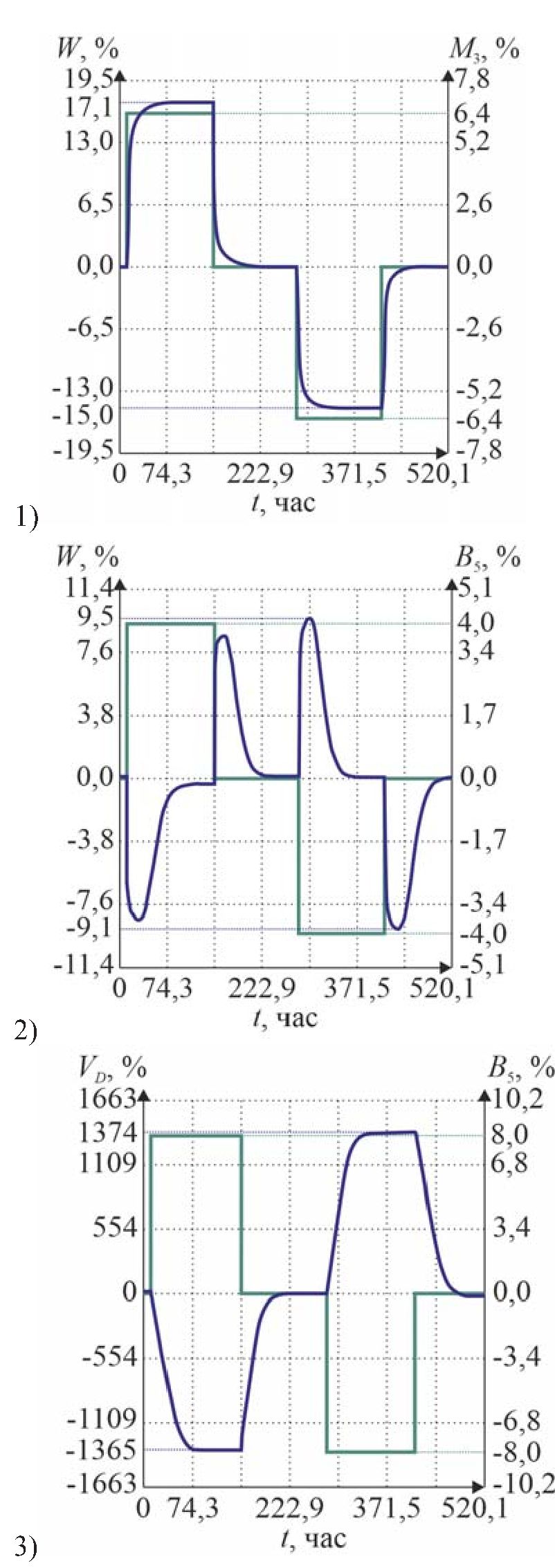 Fig. 4. Transients: 1) W when М3 changes; 2) W when В5 changes; 3) VD when В5 changes