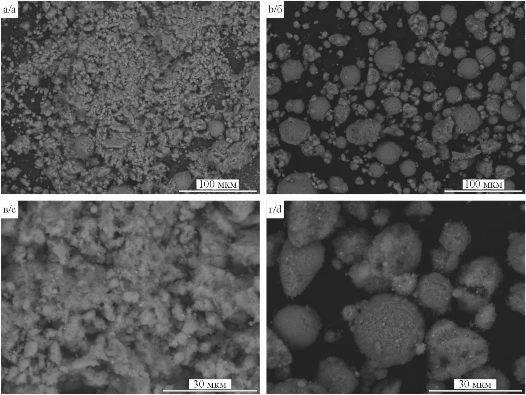 Fig. 3. Results of scanning electron microscopy of products synthesized in single-pulse (а, c) and multi-pulse (b, d) modes