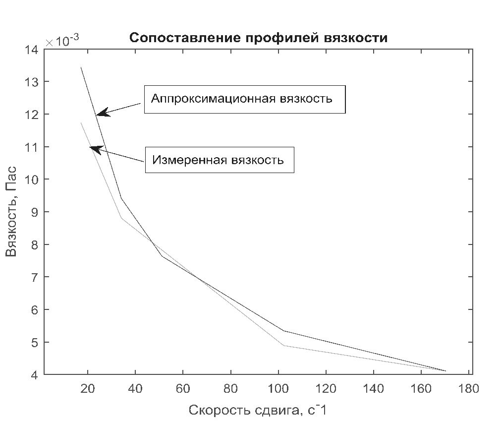 Рис. 1. Сравнение профиля измеренной вязкости раствора и аппроксимированной по степенному закону