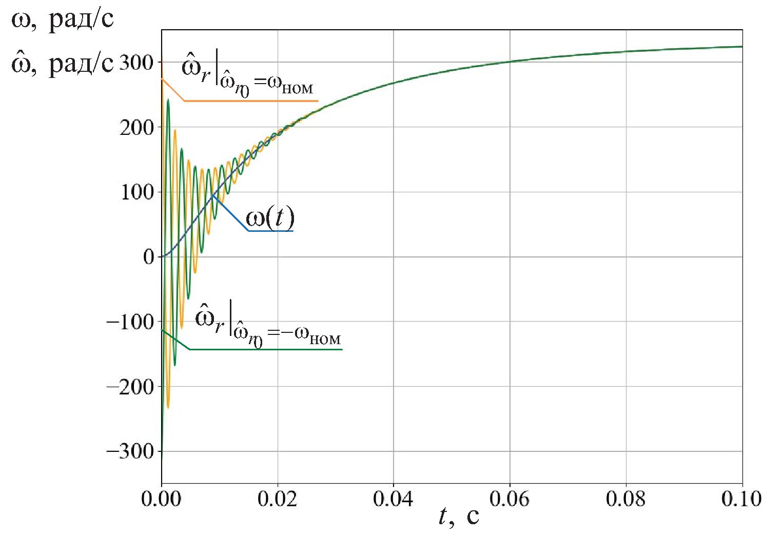 Одним из основных требований к наблюдателю является его способность к отработке рассогласования начальных условий наблюдателя и объекта. Исследуем работоспособность наблюдателя при следующих начальных условиях угловой скорости ротора: и в режиме пуска на холостом ходу, переходные характеристики исследуемого процесса изображены на рис. 1.