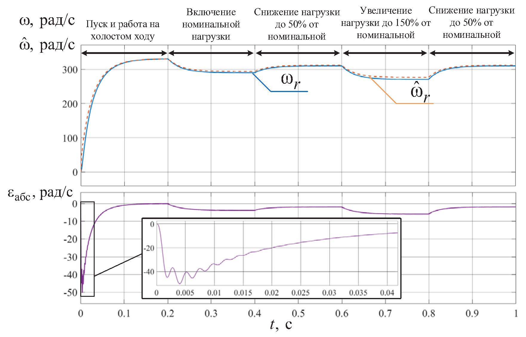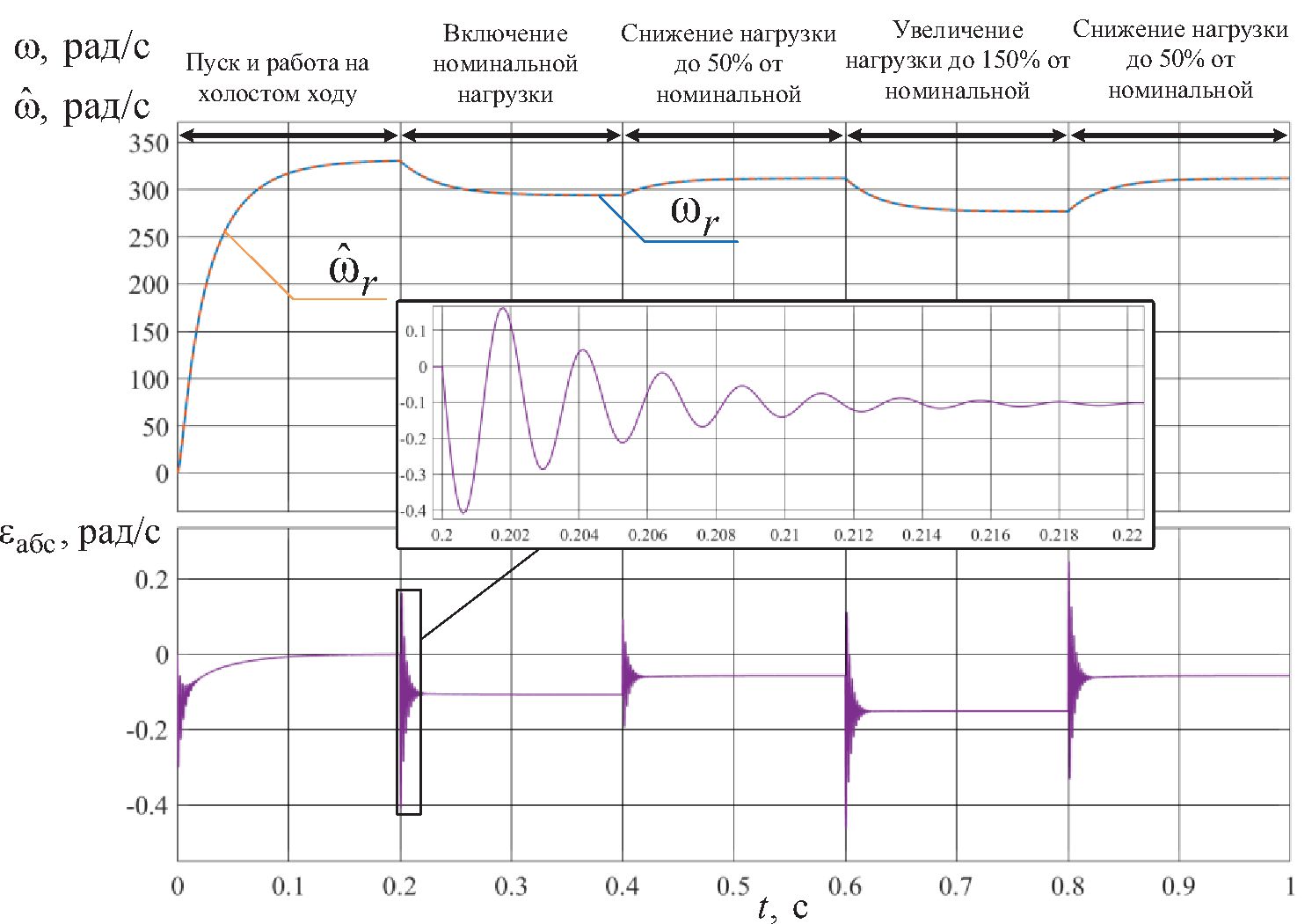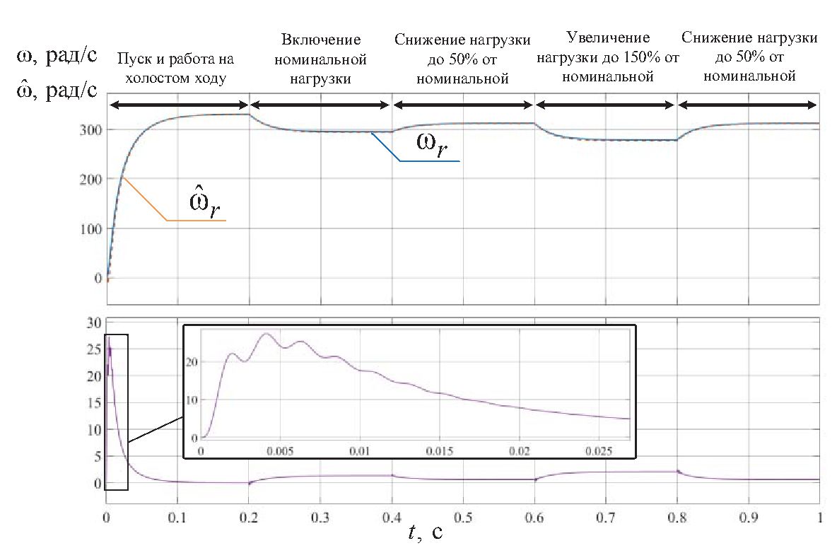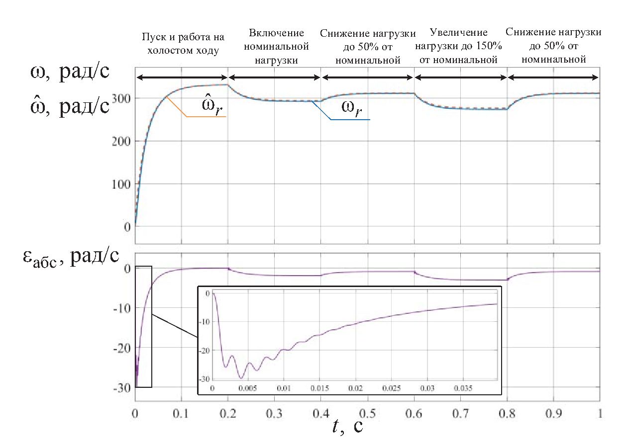 Для количественной оценки работоспособности наблюдателя рассчитывалась статическая ошибка оценок угловой скорости ротора и момента сопротивления на валу СДПМ в конце переходного процесса и в установившемся режиме, а также интегральная погрешность оценок за время переходного процесса по формуле: