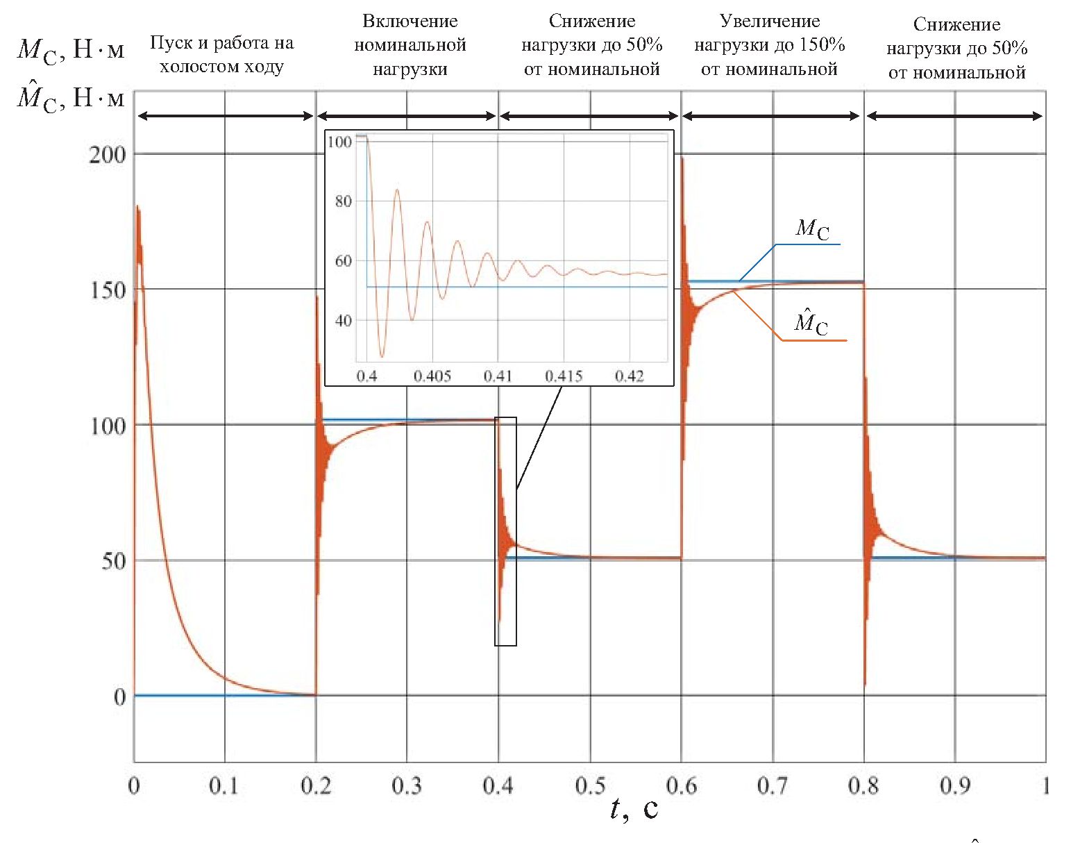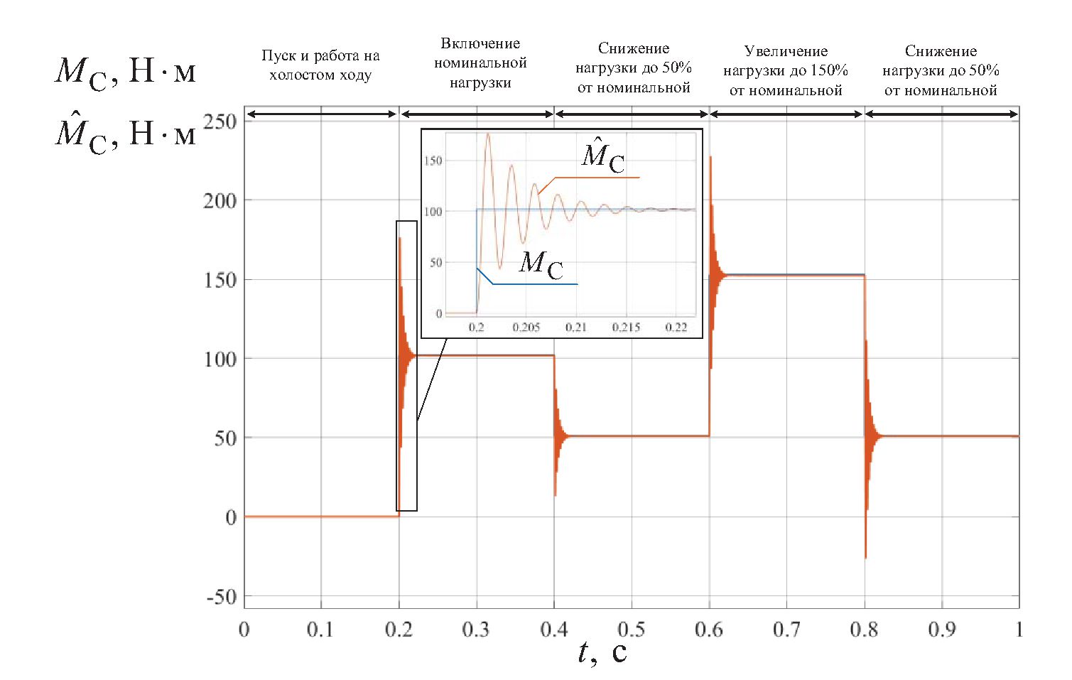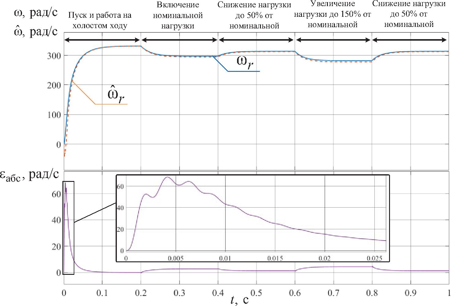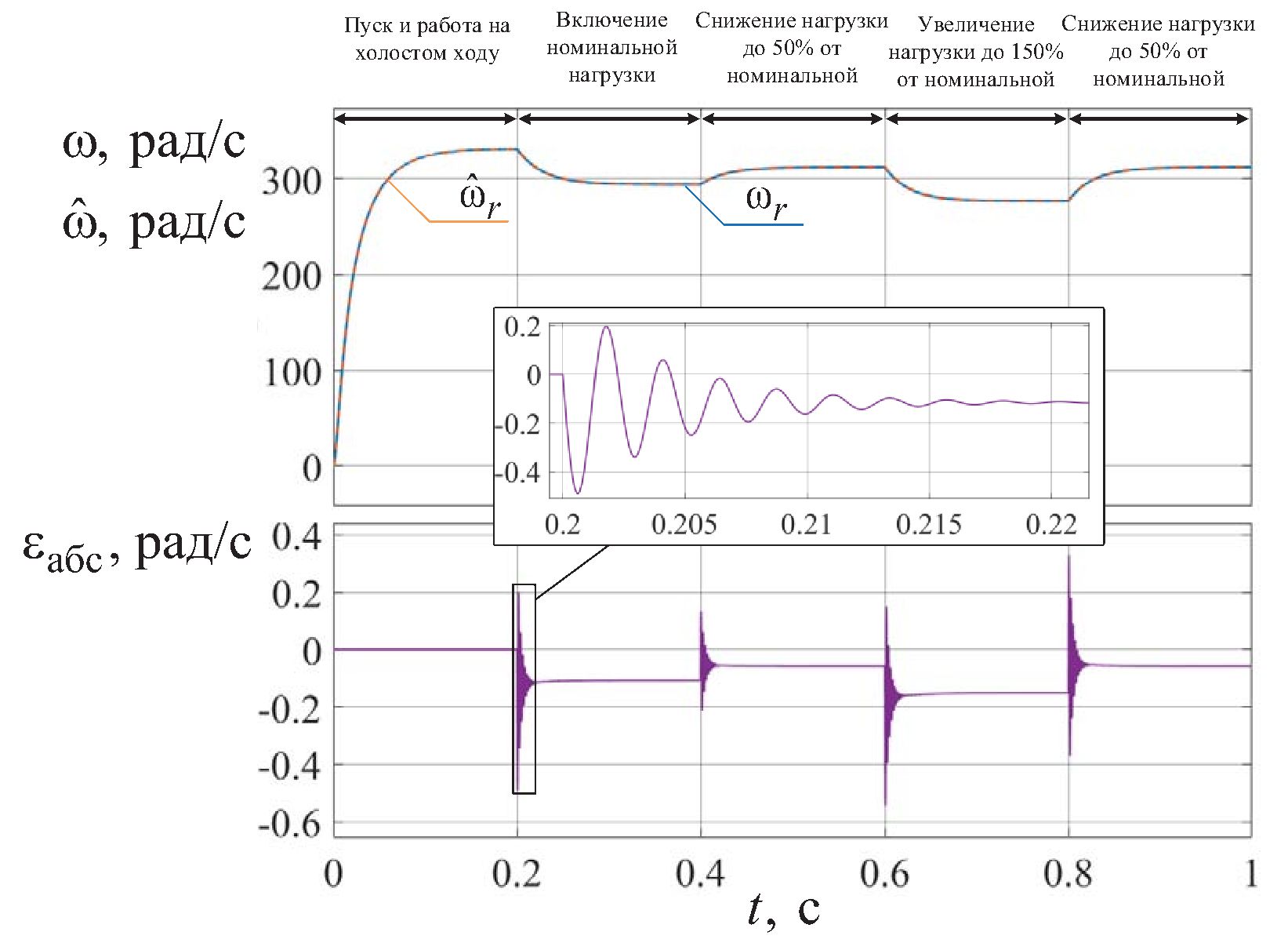 Для количественной оценки работоспособности наблюдателя рассчитывалась статическая ошибка оценок угловой скорости ротора и момента сопротивления на валу СДПМ в конце переходного процесса и в установившемся режиме, а также интегральная погрешность оценок за время переходного процесса по формуле: