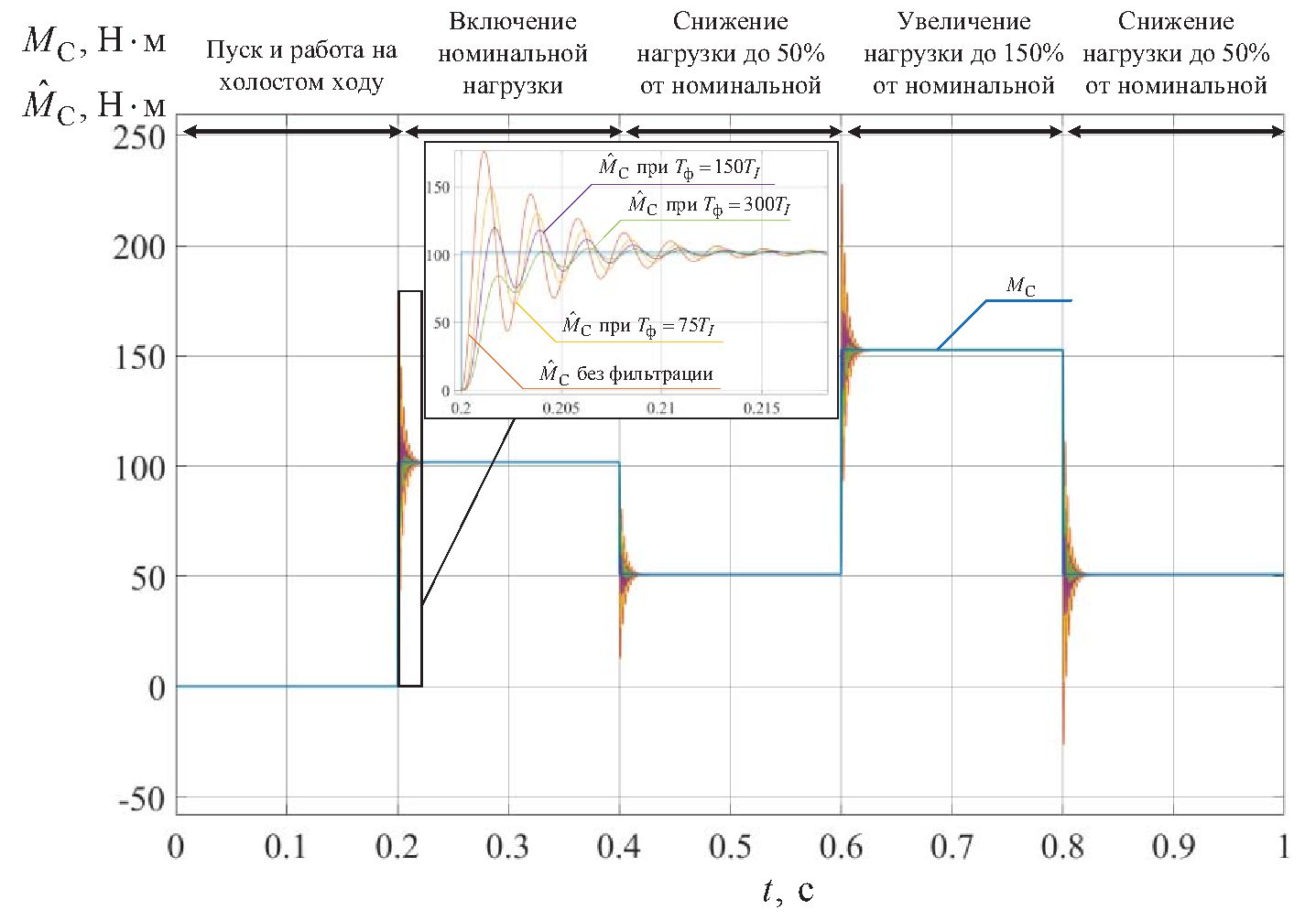 Получим оценку момента сопротивления на валу СДПМ (рис. 4) при изменяющейся нагрузке без фильтрации и при различных постоянных времени фильтра относительно коэффициента интегральной отработки невязки: 75·TI, 150·TI, 300·TI. Выполним расчет погрешности оценивания момента сопротивления на валу СДПМ для рассматриваемых режимов работы при изменении постоянной времени фильтра-постфильтратора (табл. 3).