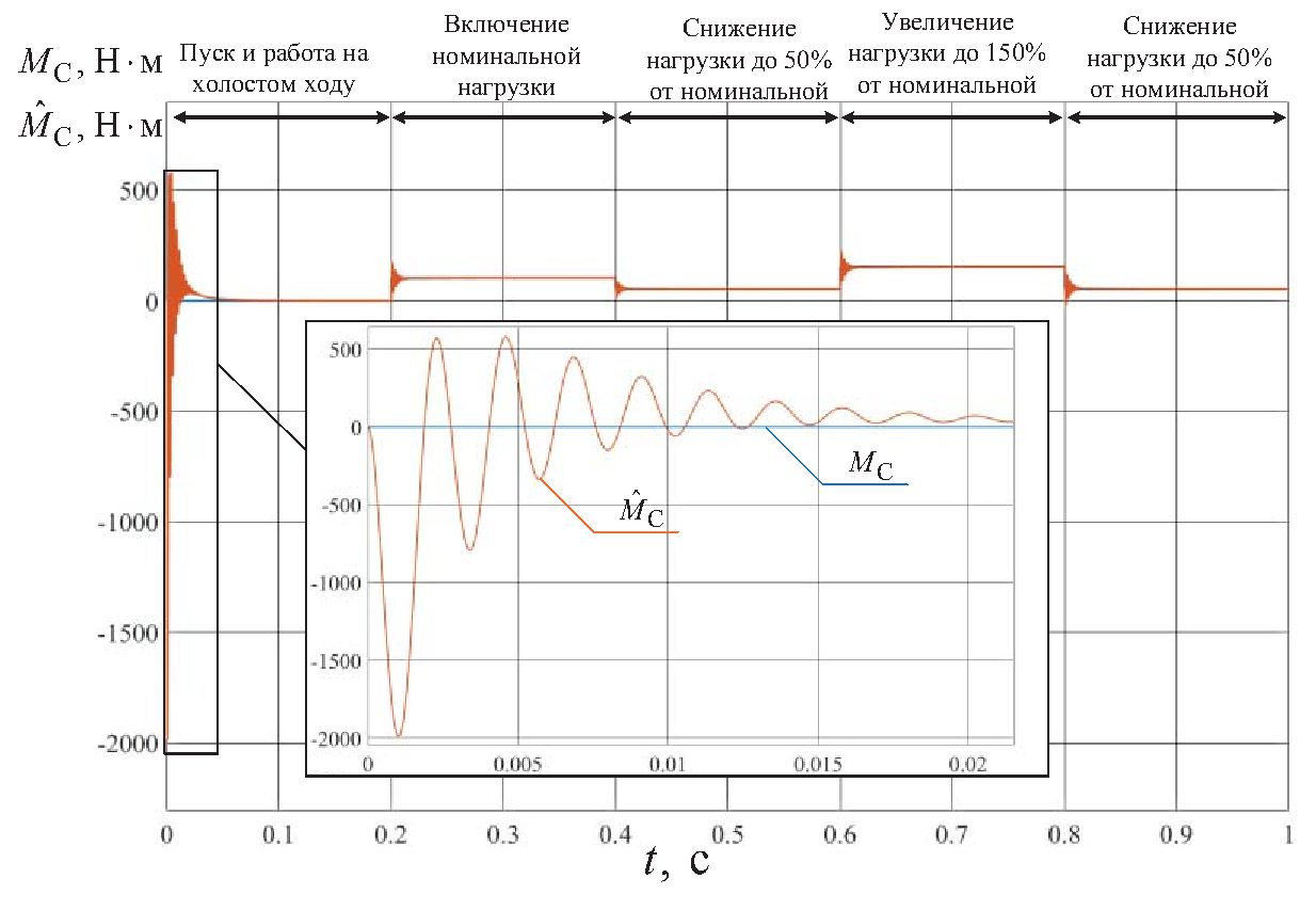 Как следует из анализа рис. 2, 3 и табл. 2, на всех участках изменения нагрузки относительная погрешность оценивания угловой скорости ротора и момента сопротивления на валу составляет не более 0,05 %.