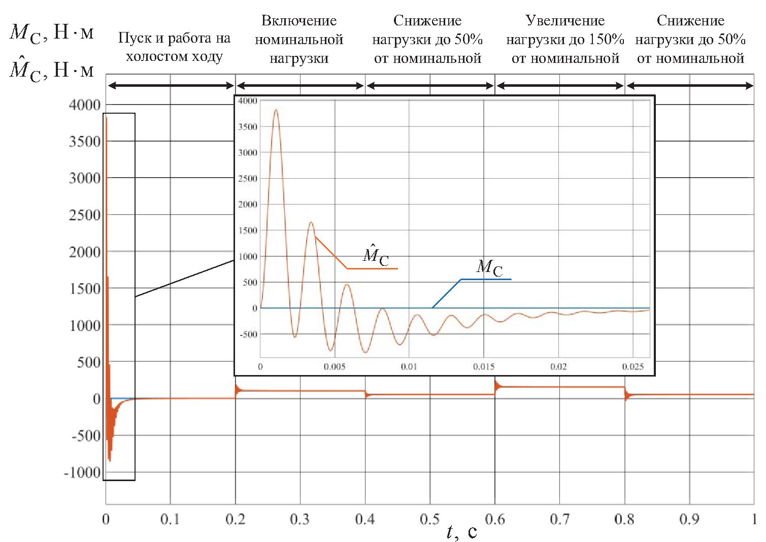Рис. 3. Переходные характеристики момента сопротивления на валу СДПМ MC(t) при изменяющейся нагрузке на валу