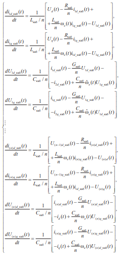 Согласно методике, представленной в [29], математическая модель длинного кабеля может быть разбита на несколько звеньев редуцированной модели в расчете 1 звено на 1 км кабельной линии. Математическая модель динамической системы «длинный кабель – синхронный двигатель с постоянными магнитами» представлена системой дифференциальных уравнений в нормальной форме Коши во вращающейся синхронной с ротором dq системе координат. Модель электромагнитных процессов в длинном кабеле описывается системой (1), модель синхронного двигателя с постоянными магнитами – системой (2).