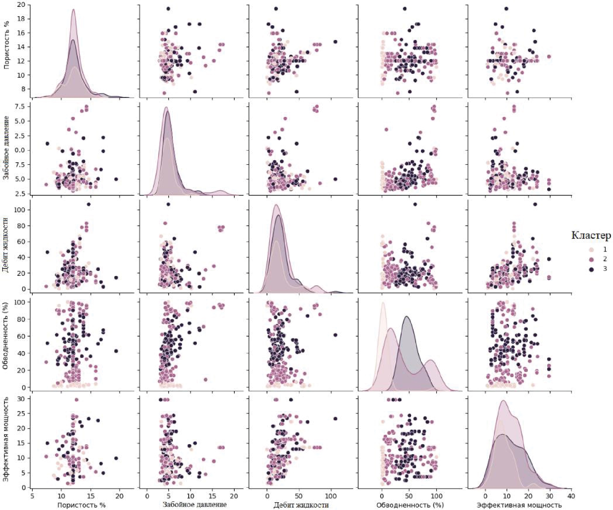 Кроме того, дифференцированно построенные регрессионные модели для каждого кластера позволяют повысить статистические метрики для прогнозирования проницаемости околоскважинной зоны. Таким образом, предлагается классифицировать исходные данные на кластеры для более точного определения проницаемости ПЗП с помощью статистических моделей. Исходными данными для классификации кластера являются: забойное давление, эффективная нефтенасыщенная толщина, пористость, дебит жидкости, обводненность. Номер кластера является искомым параметром.