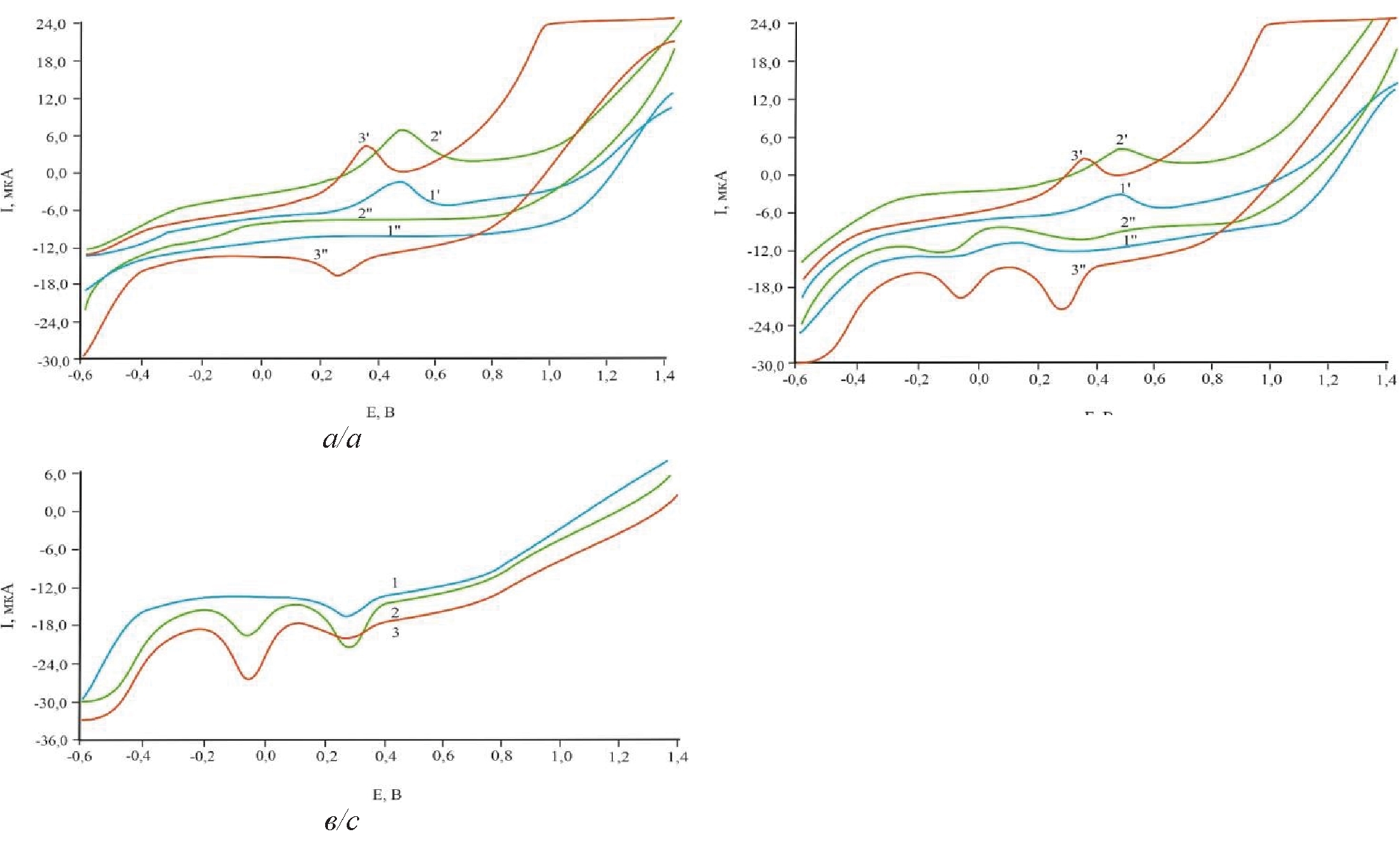 Получены вольтамперные зависимости синтезированных PdНЧ c использованием различных восстановителей представлены на рис. 1, а. Как видно из анодных кривых 1'–3', аналитические сигналы PdНЧ находятся в интервале потенциалов от 0,2 до 0,6 В.