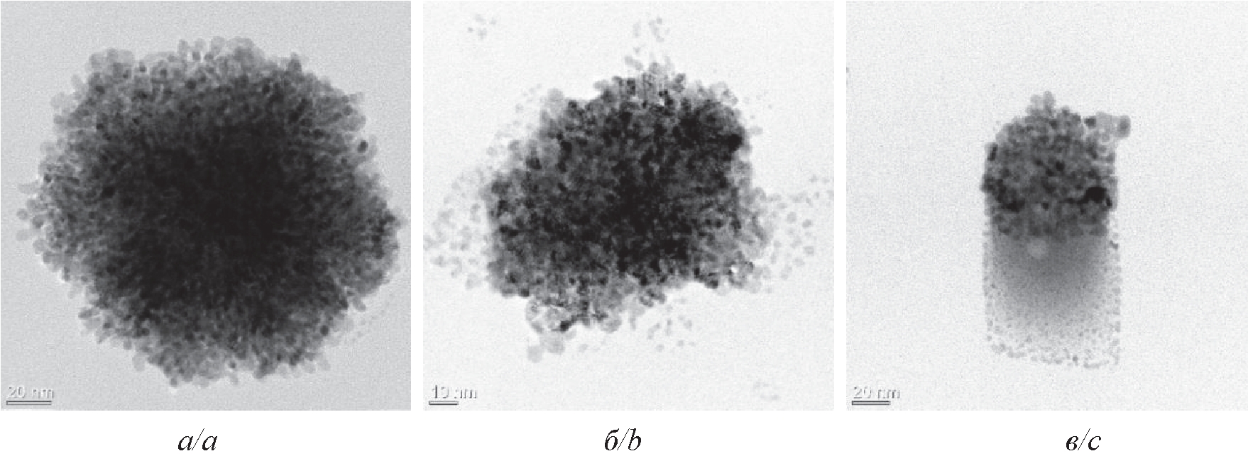 Морфология, размер и кристаллическая структура полученных PdНЧ были исследованы с использованием ПЭМ. На рис. 2 показаны ПЭМ-изображения PdНЧ, полученных по трем методикам: PdНЧ–БГ (а), PdНЧ–БГЦ (б), PdНЧ–Ц (в).
