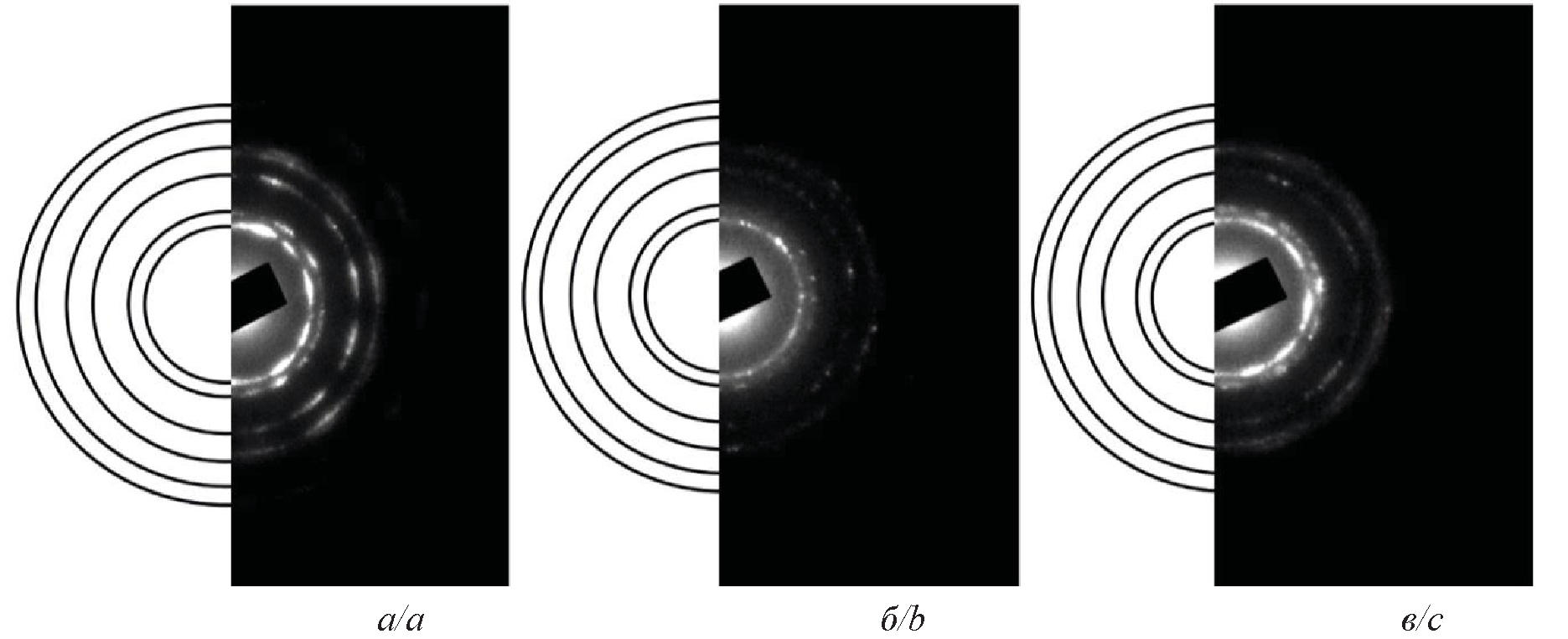 Рис. 4. Микродифракционные картины PdНЧ: а) PdНЧ–БГ; б) PdНЧ–Ц; в) PdНЧ–БГЦ