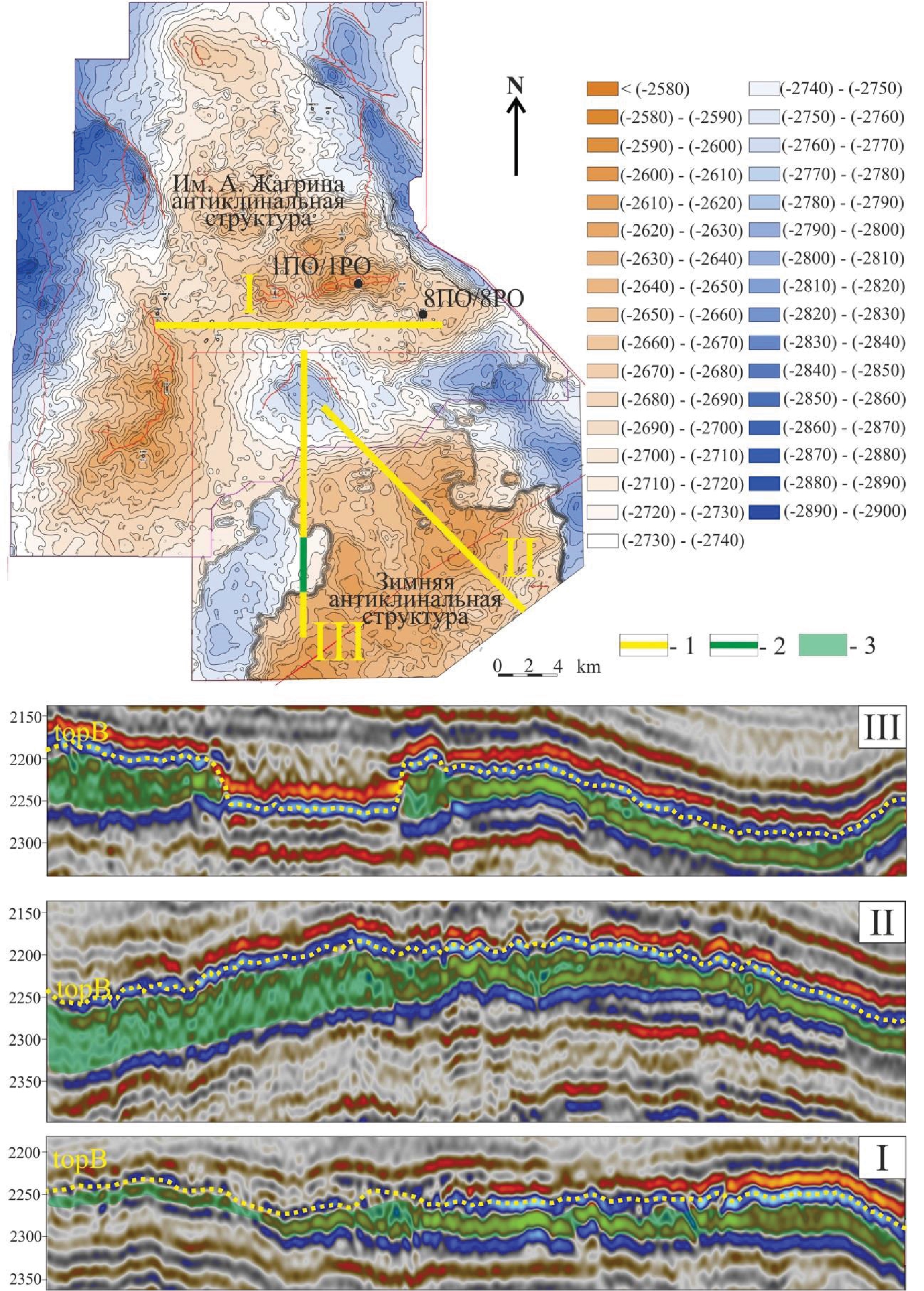 Рис. 4. Структурная карта по кровле горизонта В (подошва БС) и сейсмические разрезы, характеризующие проявление АРБ (topB – кровля БС) (1 – часть профиля, где в разрезе отмечается развитие АРБ, 2 – часть профиля, где в разрезе отмечается «классическое» строение БС, 3 – участок разреза, характеризующийся развитием АРБ)