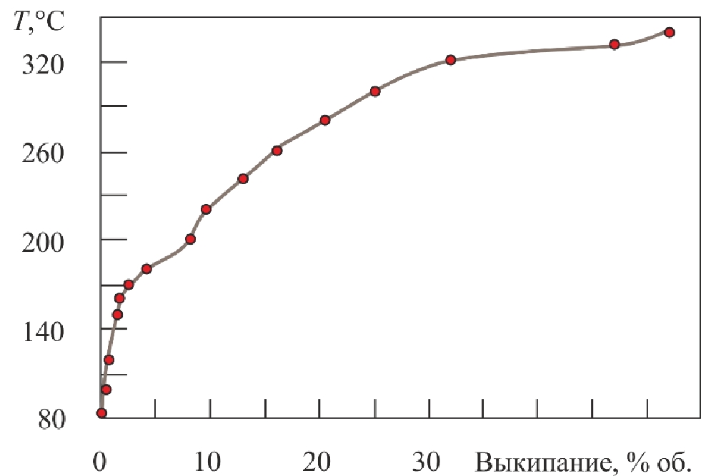 Для проведения теплоэнергетической интеграции УПСН были определены начальные и конечные температуры всех технологических потоков на установке и значения их материальных расходов. От центральной заводской лаборатории получены значения теплофизических параметров всех потоков, выполнена разгонка товарной нефти (рис. 2) и получен компонентный состав ПНГ (табл. 1). Эти значения использовались для определение теплотворной способности ПНГ и для проверки материального и теплового баланса УПСН.