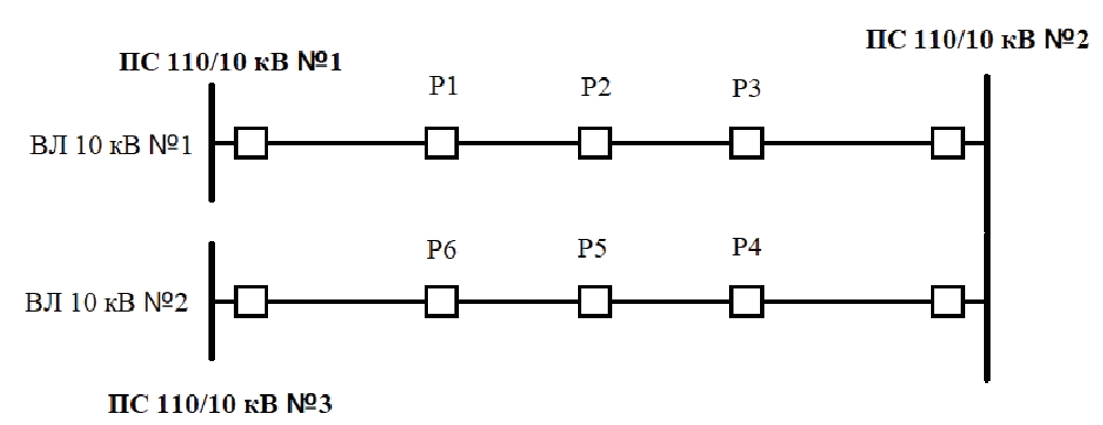 Для упрощения отпайки от ВЛ-10 кВ на рисунке не обозначены. Рассматриваемая сеть состоит из трех питающих подстанций классом напряжения 110/10 кВ и двух воздушных линий напряжением 10 кВ с двусторонним питанием. В магистрали обеих линий установлено по три реклоузера. Линии выполнены проводом АС-70/11. Резервы мощности питающих трансформаторных подстанций показаны в табл. 1.