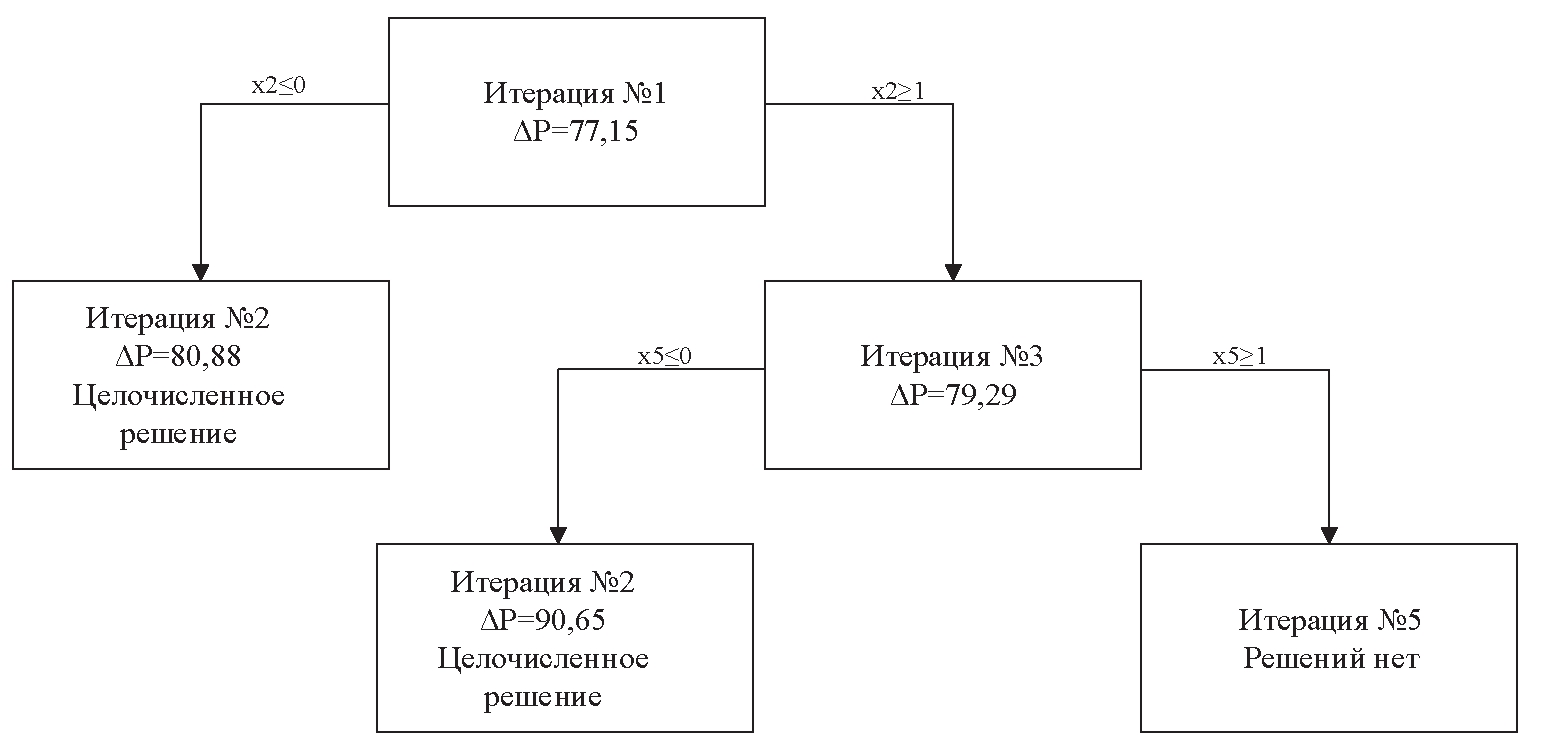 Среди всех вершин полученного дерева решений наилучшей оценкой обладает вершина «Итерация № 2». Таким образом, в качестве оптимального решения исходной задачи выбираем решение подзадачи на итерации № 2: