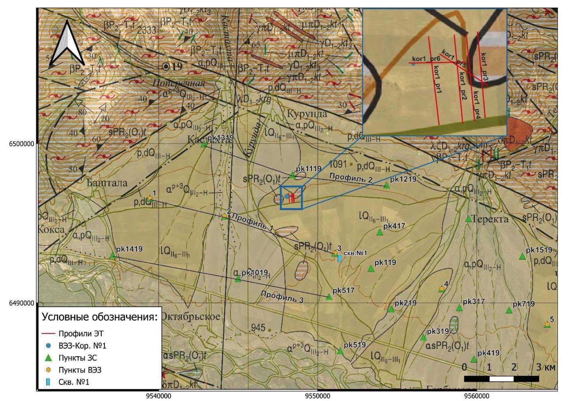 Строение верхней части депрессии осложняется выходами на дневную поверхность коренных пород фундамента, представленных метаморфическими породами ордовикского возраста (sPR2(O1)t). На участках выходов этих пород в полевые сезоны с 2020 по 2023 гг. были выполнены измерения методом ЭТ по системе профилей в западной и центральной частях Уймонской впадины. В текущей статье исследуются измерения, приуроченные к выходам пород фундамента в западной части депрессии (рис. 1). Строение таких участков до сих пор было непонятно. Можно рассмотреть несколько предположений образования выходов коренных пород. По мнению специалистов-геологов, это либо обрывки верхушек антиклиналий, сдвинутые мощными тектоническими движениями, либо верхняя часть антиклинальных складок кровли фундамента, поднятая на дневную поверхность в местах его относительно неглубокого залегания во время резкой активизации орогенных процессов в четвертичном периоде, которая образует внутривпадинную перемычку [6].