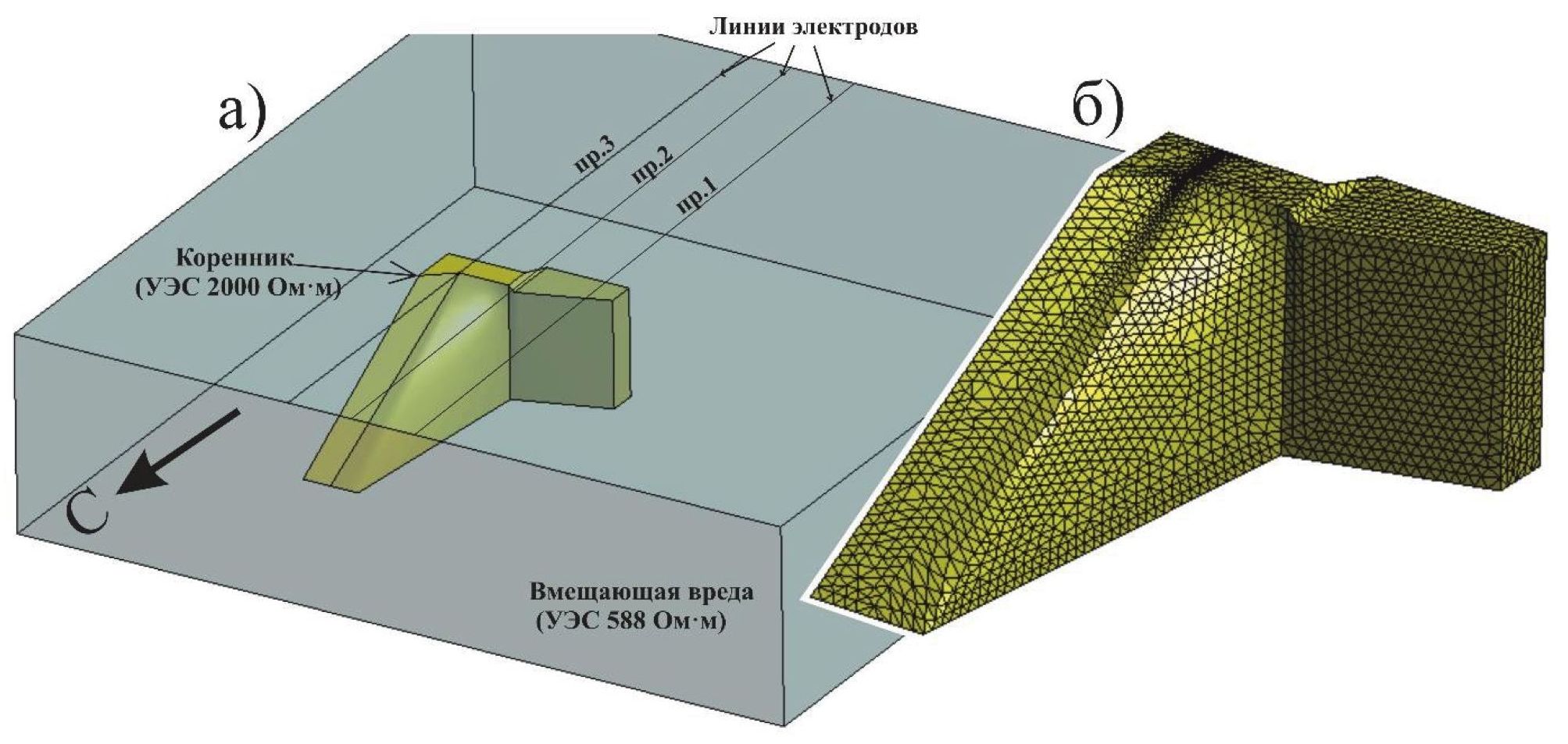 Математическое моделирование, выполненное также с использованием программы DiInSo, осуществляется в трехмерной области, которая задана с помощью тетраэдральной сетки. В выбранном программном комплексе нет встроенной функции генерации сетки, таким образом, данный шаг выполняется в сторонней программе. Программный комплекс DiInSo поддерживает форматы следующих генераторов сеток: GiD, SALOME, NetGen и Gmsh, пользователь может выбрать одну из перечисленных выше программ по собственным предпочтениям. Для геометрического построения модели с последующей генерацией конечно-элементной сетки в данной работе применялась программа GiD [20]. В качестве примера на рис. 3, а показана модель, в которую входит объект исследования во вмещающей однородной среде с линией размещения электродов по профилю 3 (рис. 3, а) и отдельно сам объект (коренные породы) с сеткой (рис. 3, б). Мелкость разбиения задавалась следующим образом: на линии электродов – 2, на поверхностях и объеме объекта – 10 и в среде – 50. Под мелкостью разбиения понимается размер элементов (линий, поверхностей, объемов). Размер здесь – это средняя длина ребра соответствующего элемента сетки.