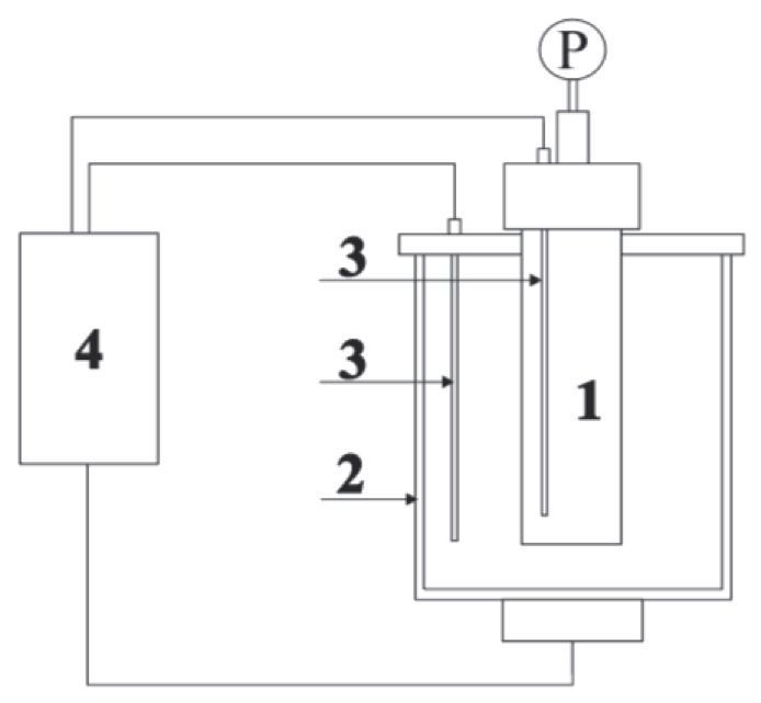 Fig.1. Scheme of a laboratory unit: 1 – batch reactor, 2 – furnace, 3 – thermocouple, 4 – programmable logic controller, P – pressure-gauge [44]