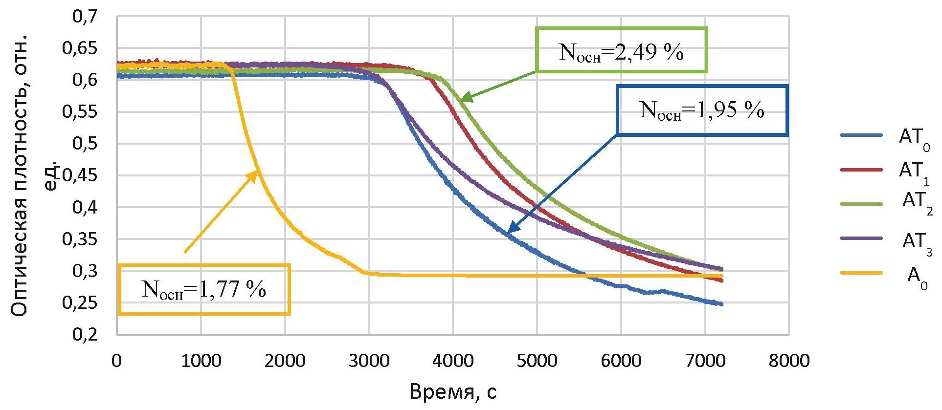 Агрегативная устойчивость синтетических асфальтеноподобных веществ полностью коррелирует с содержанием в них Nосн. Так, коллоидная стабильность синтетических асфальтенов повышается с увеличением в них содержания Nосн. Точка начала осаждения АТ0 (Nосн=1,95 мас. %) наступает на 20 % ранее по сравнению с АТ2 (Nосн=2,49 мас. %). Таким образом, установлено, что коллоидная стабильность асфальтенов повышается с увеличением в их молекулярной структуре содержания Nосн.