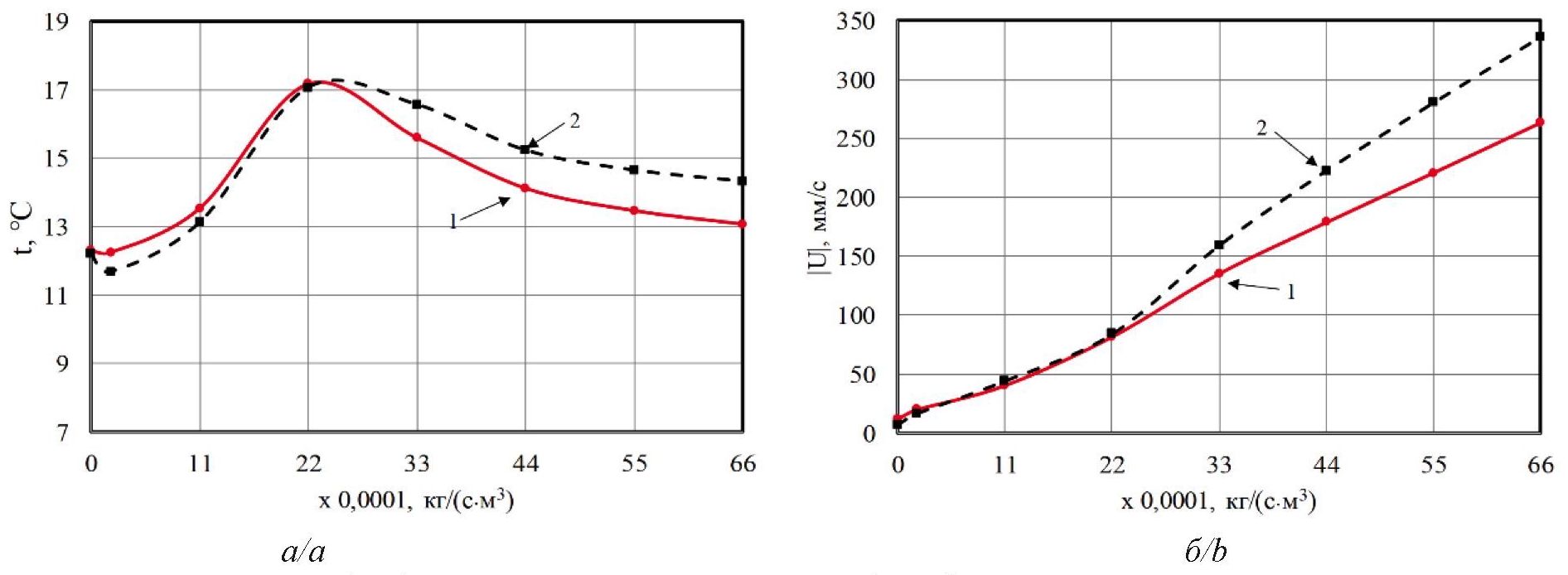 Рис. 20. Зависимость средней температуры (а) и скорости (б) воздуха в локальных зонах (0<Y<2 м) на расстоянии 40 см от панели слева (1) и справа (2) в момент времени 60 мин от расхода воздуха