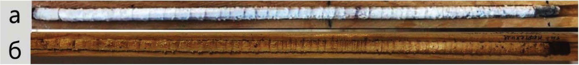 Рис. 2. Фотография возрастного керна сосны далатской (Pinus dalatensis Ferré) (а) и сосны обыкновенной (Pinus sylvestris L.) из Томской области (б) (справа – кора; слева – сердцевина)