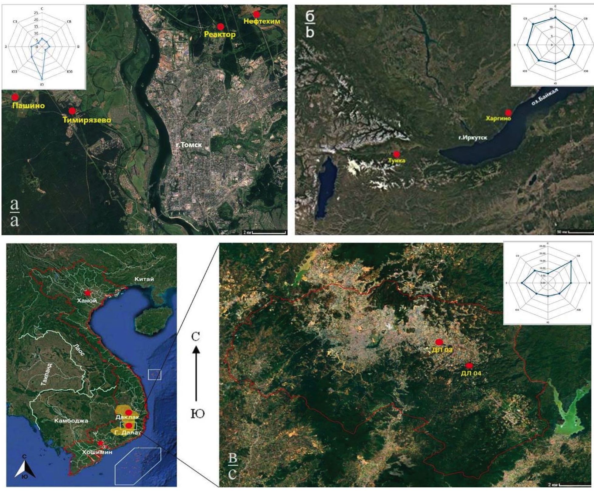 Рис. 3. Карта-схема размещения точек отбора проб: а) Томская область; б) Иркутская область и Республика Бурятия; в) г. Далат