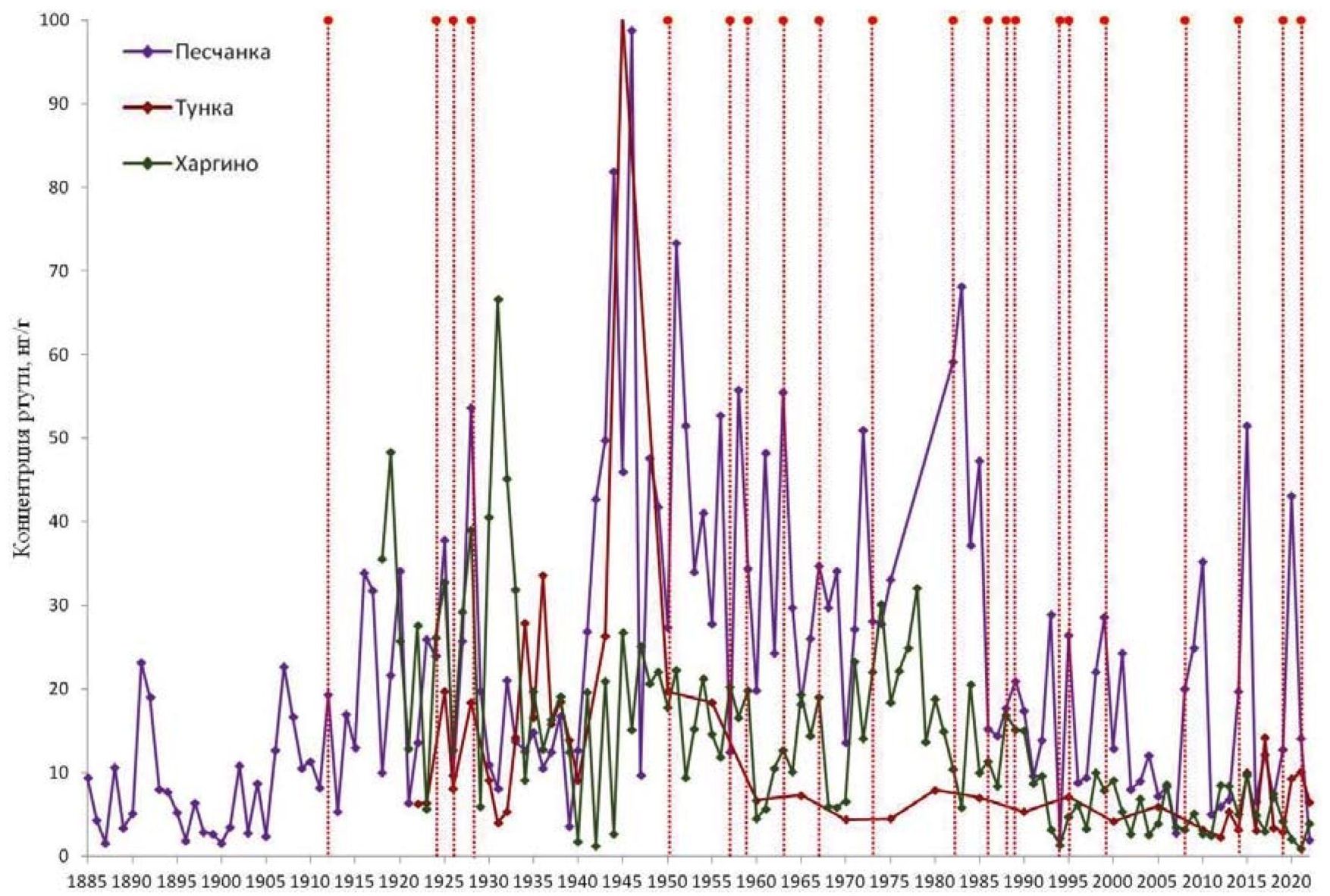 С 1970-х гг. в Иркутской области были размещены ведущие промышленные комплексы России, включая тепловые электростанции, металлургические предприятия, химическую и целлюлозно-бумажную промышленности. Вследствие чего сформировалась техногенная зона ртутного загрязнения [46]. Высокие уровни содержания Hg были отмечены в разных природных объектах Иркутской области [47].